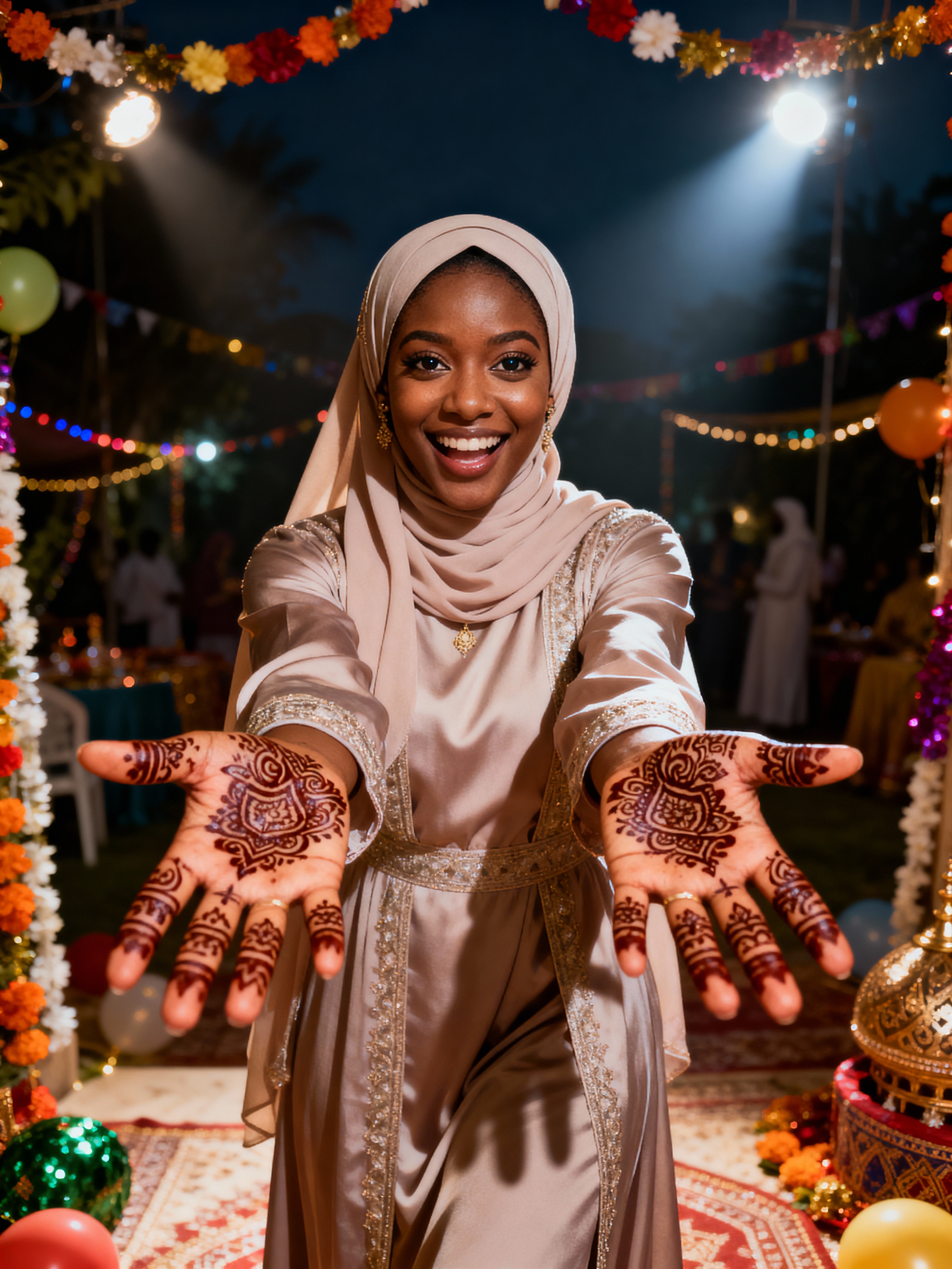 a model in a modest yet fashionable Eid outfit , capturing their joyful energy during the celebrations, with henna designs and festive decorations