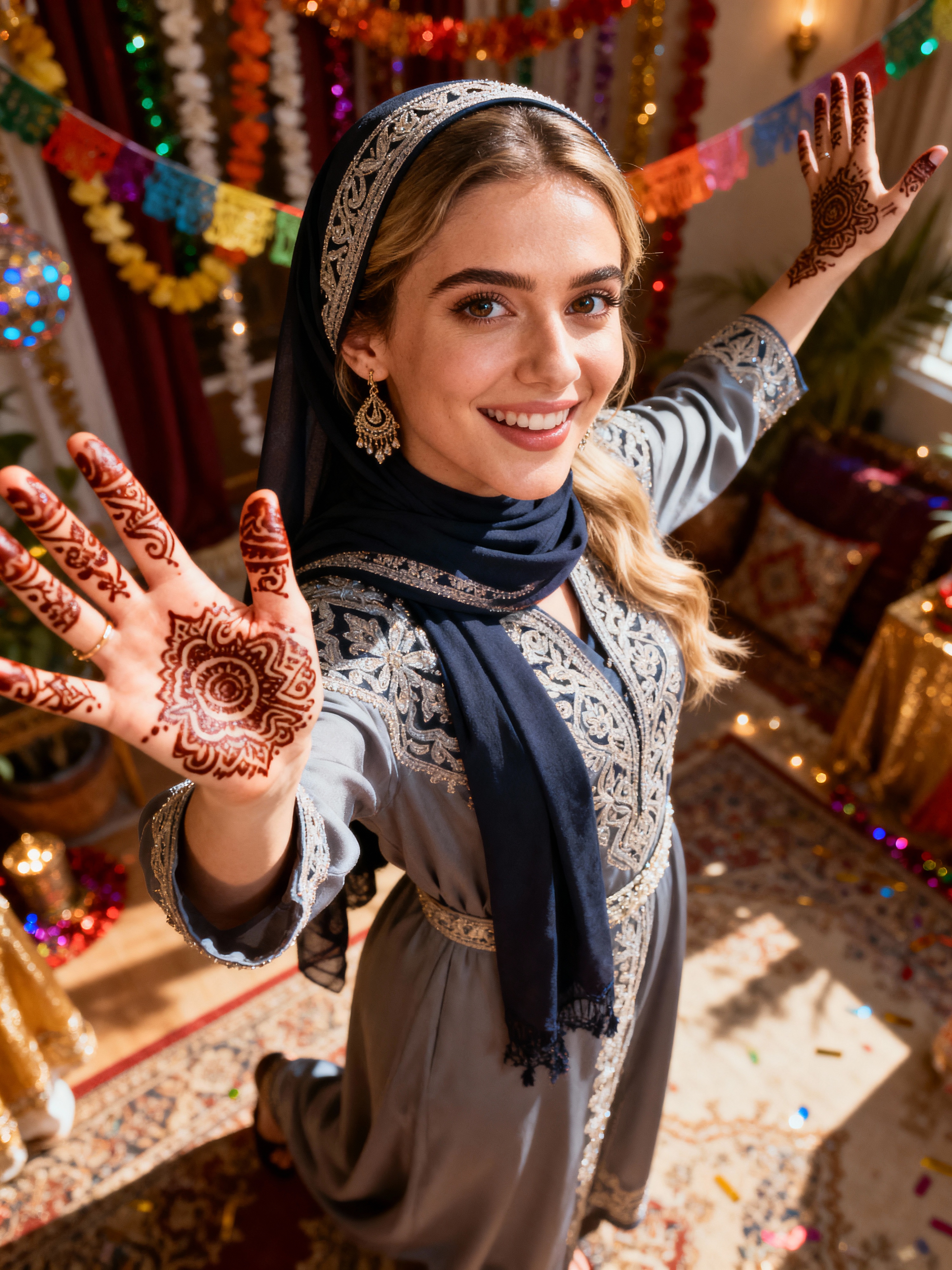 a model in a modest yet fashionable Eid outfit , capturing their joyful energy during the celebrations, with henna designs and festive decorations