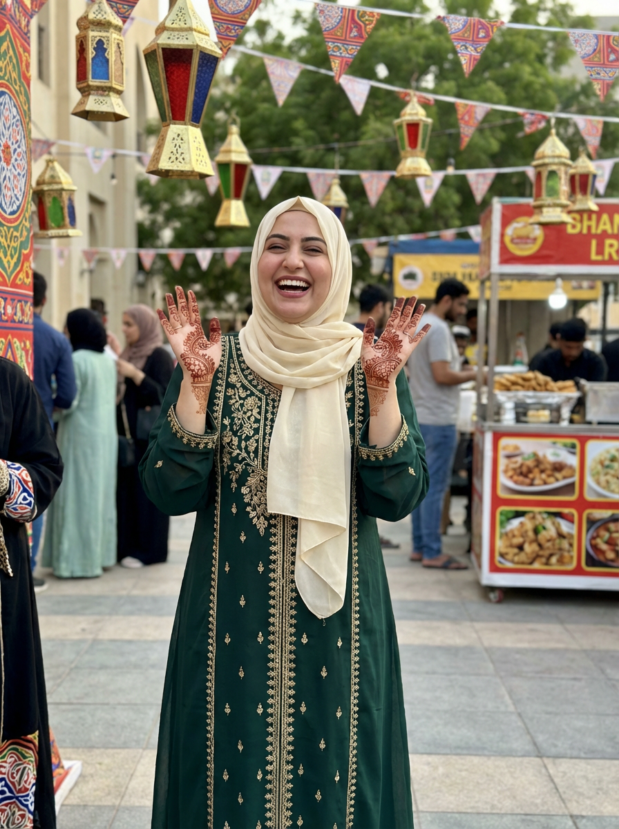 a model in a modest yet fashionable Eid outfit , capturing their joyful energy during the end of Ramadan celebrations, with henna designs and festive decorations
