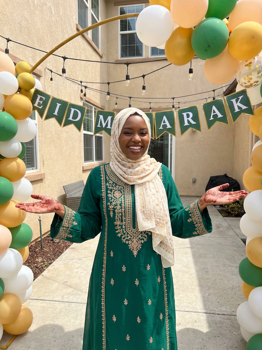a model in a modest yet fashionable Eid outfit , capturing their joyful energy during the end of Ramadan celebrations, with henna designs and festive decorations