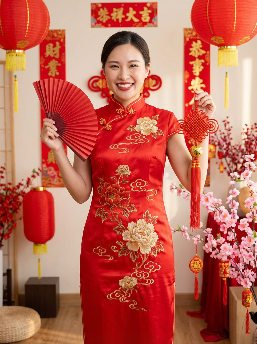 a model in a silk qipao with embroidered details , embodying the joyful and prosperous nature of Chinese New Year, with a red fan or lucky ornament in hand