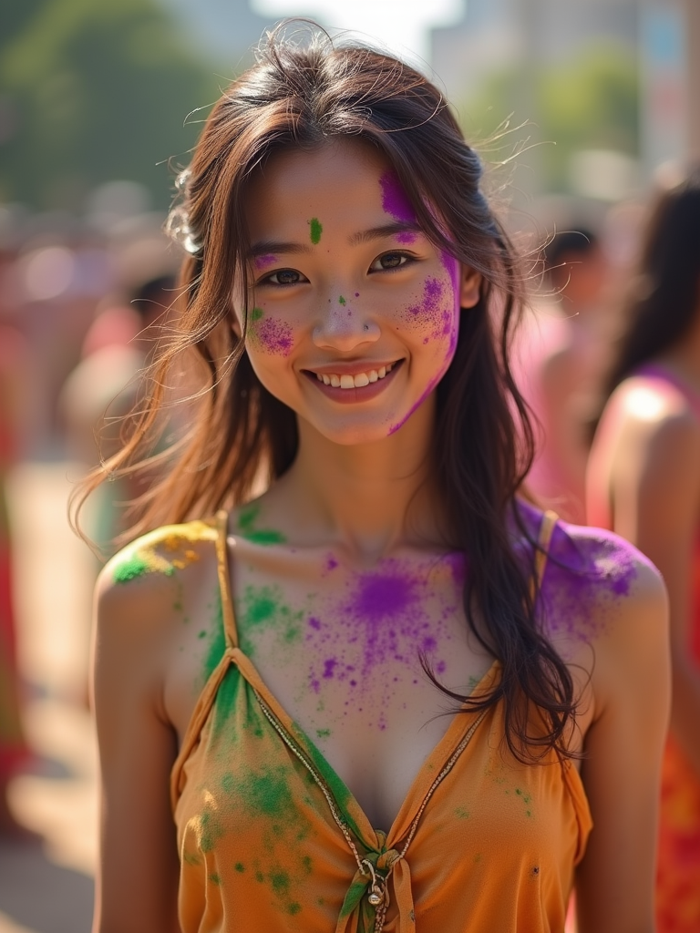 a model in a simple cotton outfit , capturing their infectious energy during Holi, with their face and clothes beautifully decorated with green, orange, and purple colors