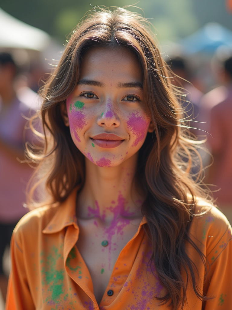 a model in a simple cotton outfit , capturing their infectious energy during Holi, with their face and clothes beautifully decorated with green, orange, and purple colors