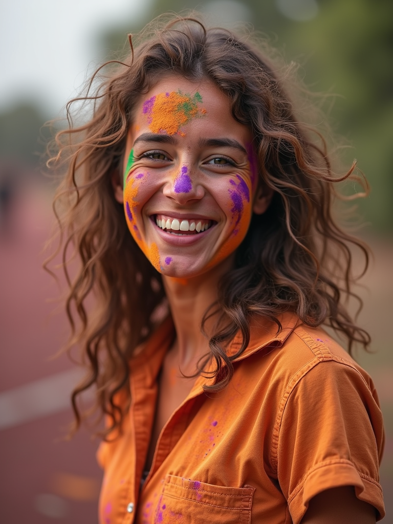 a model in a simple cotton outfit , capturing their infectious energy during Holi, with their face and clothes beautifully decorated with green, orange, and purple colors