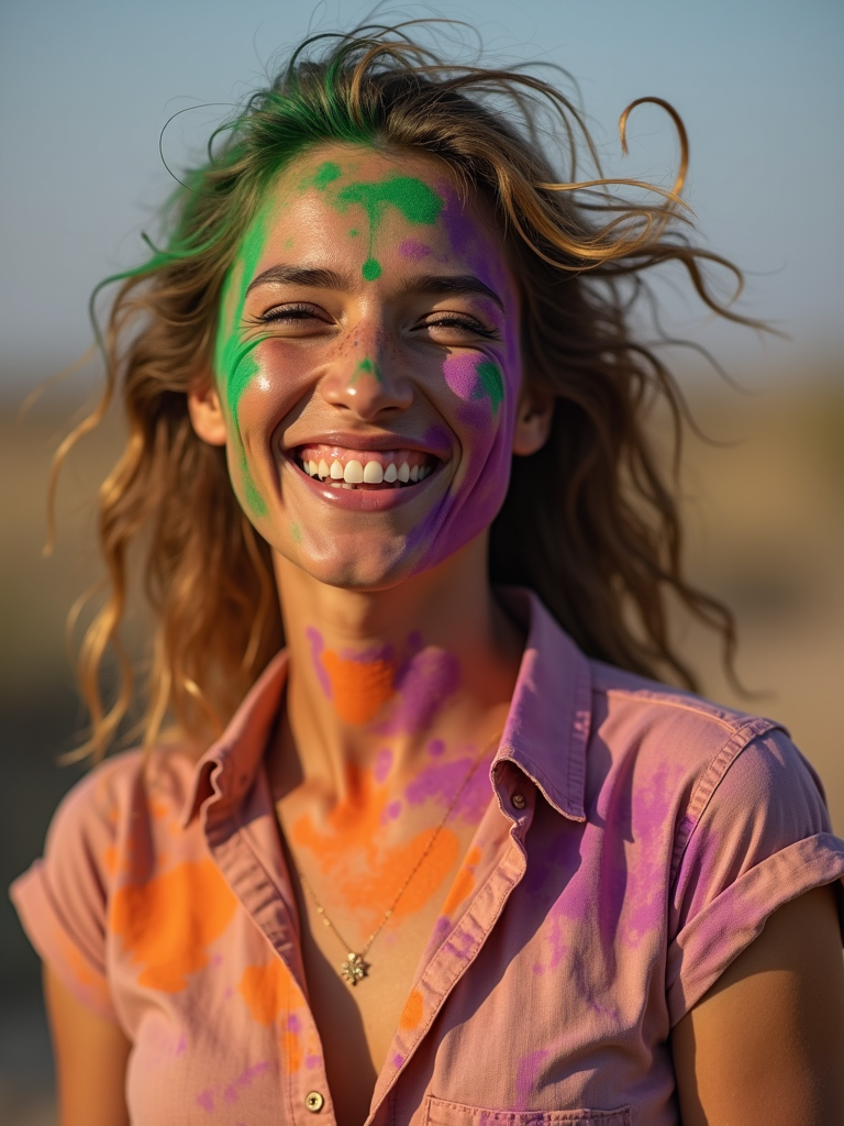 a model in a simple cotton outfit , capturing their infectious energy during Holi, with their face and clothes beautifully decorated with green, orange, and purple colors
