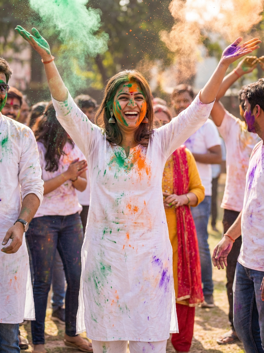 a model in a simple cotton outfit , capturing their infectious energy during Holi, with their face and clothes beautifully decorated with green, orange, and purple colors