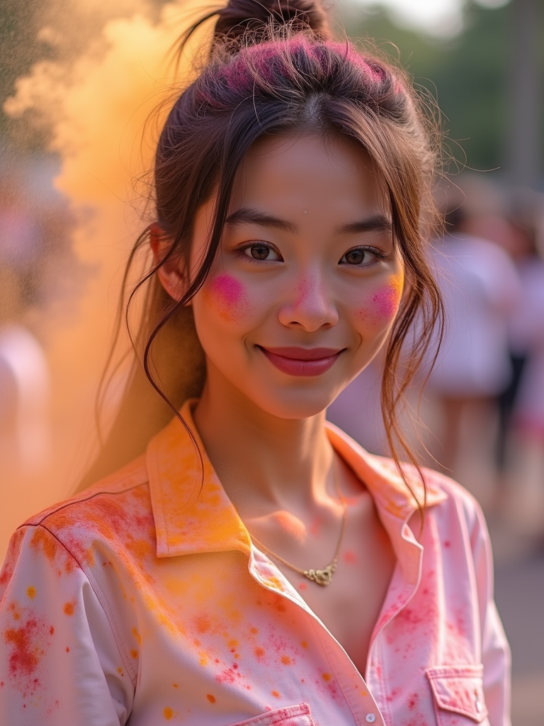 a model in a simple white outfit now stained with colorful Holi powders , embodying the free-spirited and joyful nature of the festival of colors