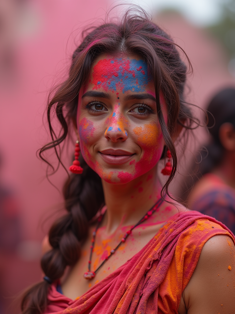 a model in a traditional outfit now barely recognizable under layers of Holi colors , embodying the playful culture of Holi where everyone becomes a canvas