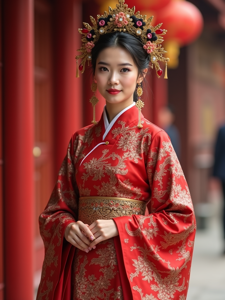 a model in a traditional outfit with modern fashion elements , embodying the balance of tradition and contemporary life during Chinese New Year