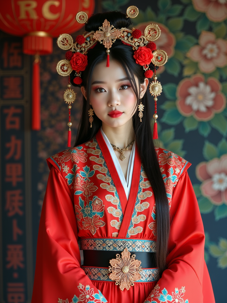 a model in a traditional outfit with modern fashion elements , embodying the balance of tradition and contemporary life during Day of the Dead