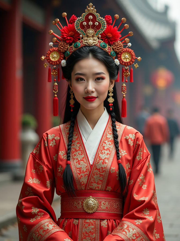 a model in a traditional outfit with modern fashion elements , embodying the balance of tradition and contemporary life during Day of the Dead