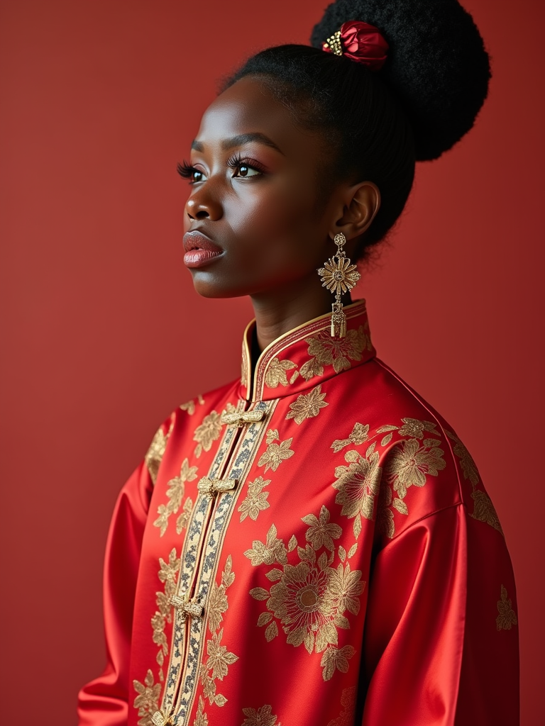a model in a traditional outfit with modern fashion elements , embodying the balance of tradition and contemporary life during Chinese New Year