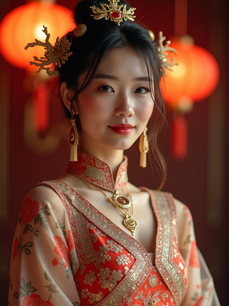 a model in a traditional outfit with modern fashion elements , embodying the balance of tradition and contemporary life during Hanukkah