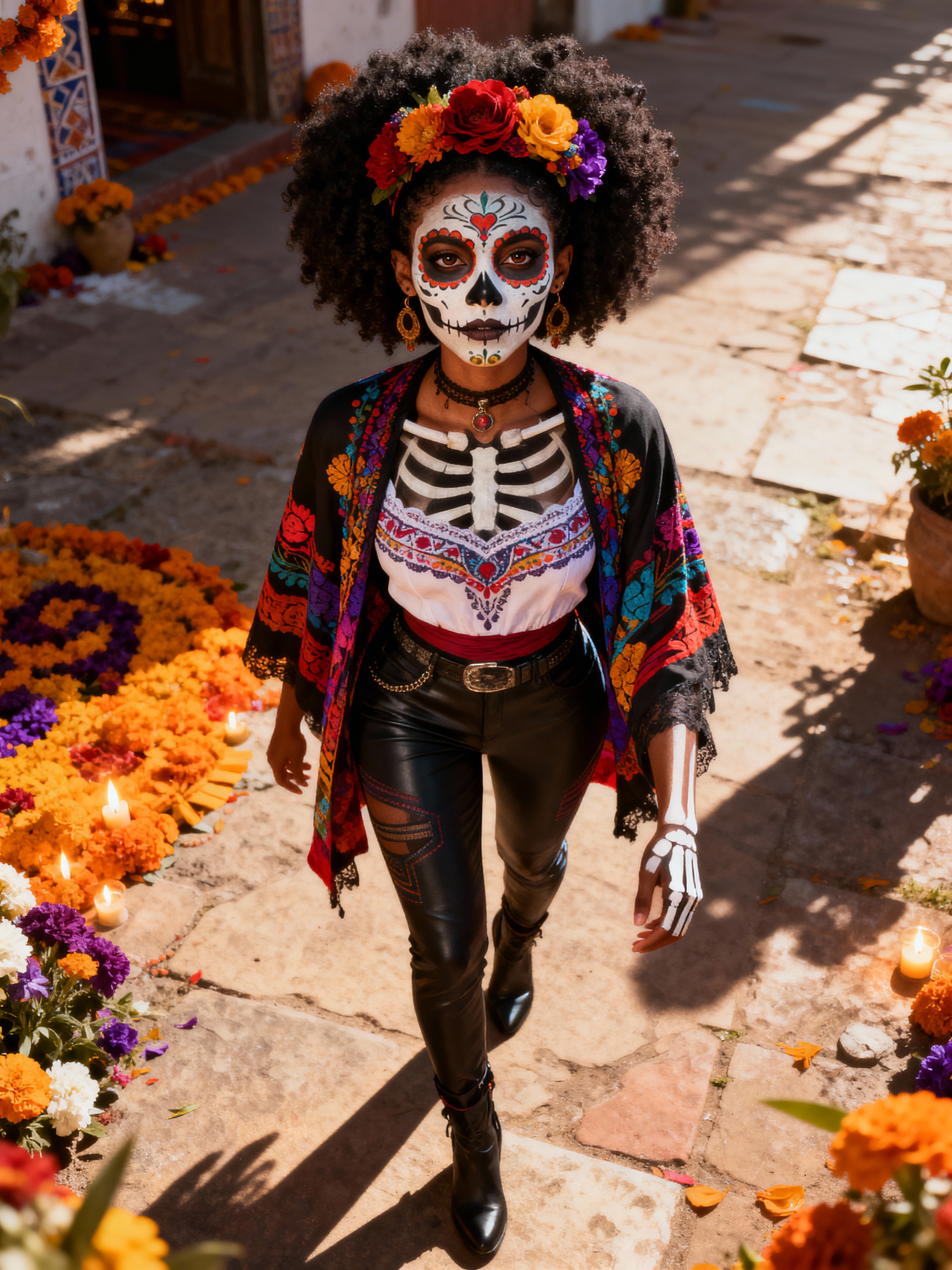 a model in a traditional outfit with modern fashion elements , embodying the balance of tradition and contemporary life during Day of the Dead