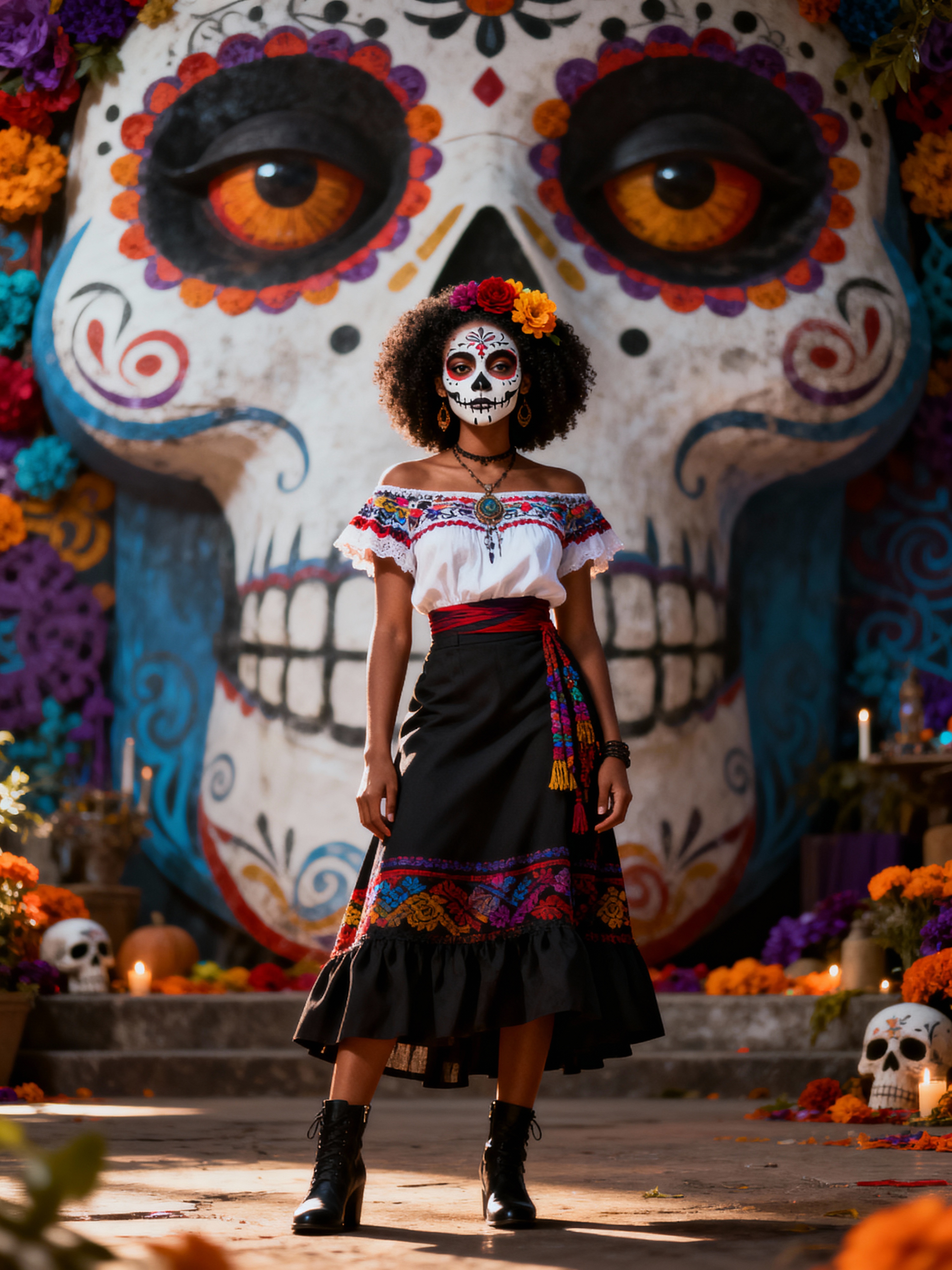 a model in a traditional outfit with modern fashion elements , embodying the balance of tradition and contemporary life during Day of the Dead