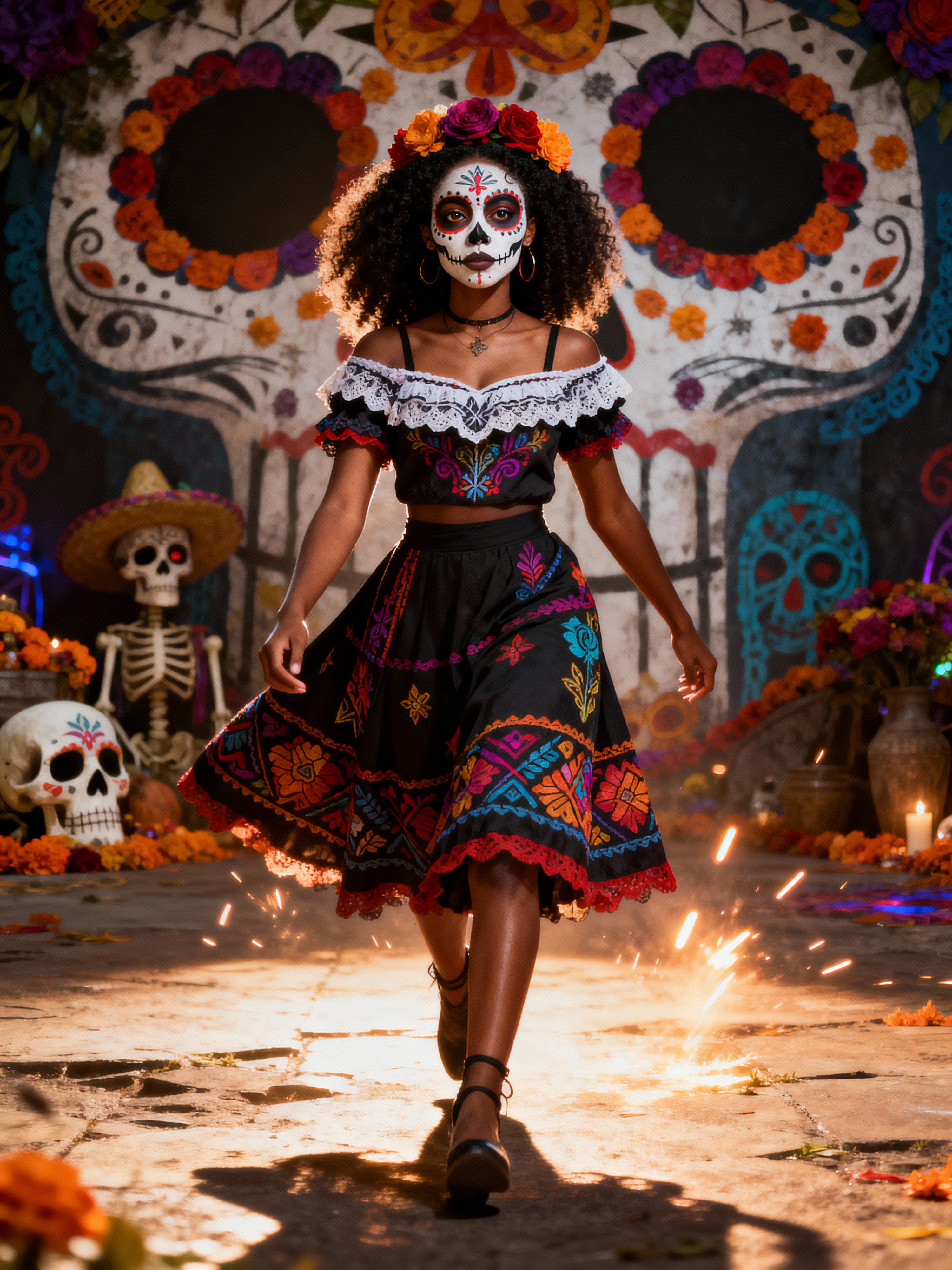a model in a traditional outfit with modern fashion elements , embodying the balance of tradition and contemporary life during Day of the Dead