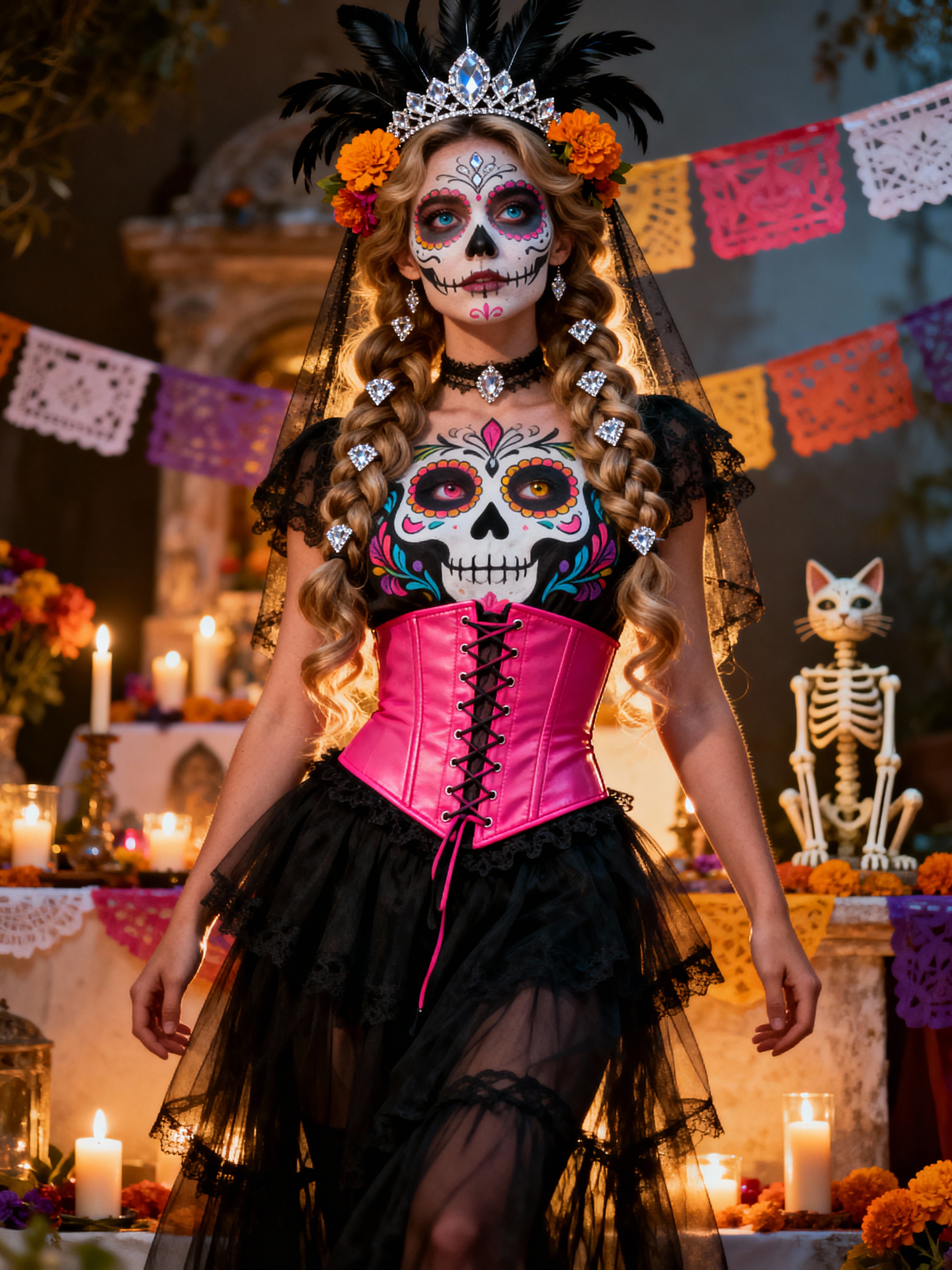 a model in a traditional outfit with modern fashion elements , embodying the balance of tradition and contemporary life during Day of the Dead