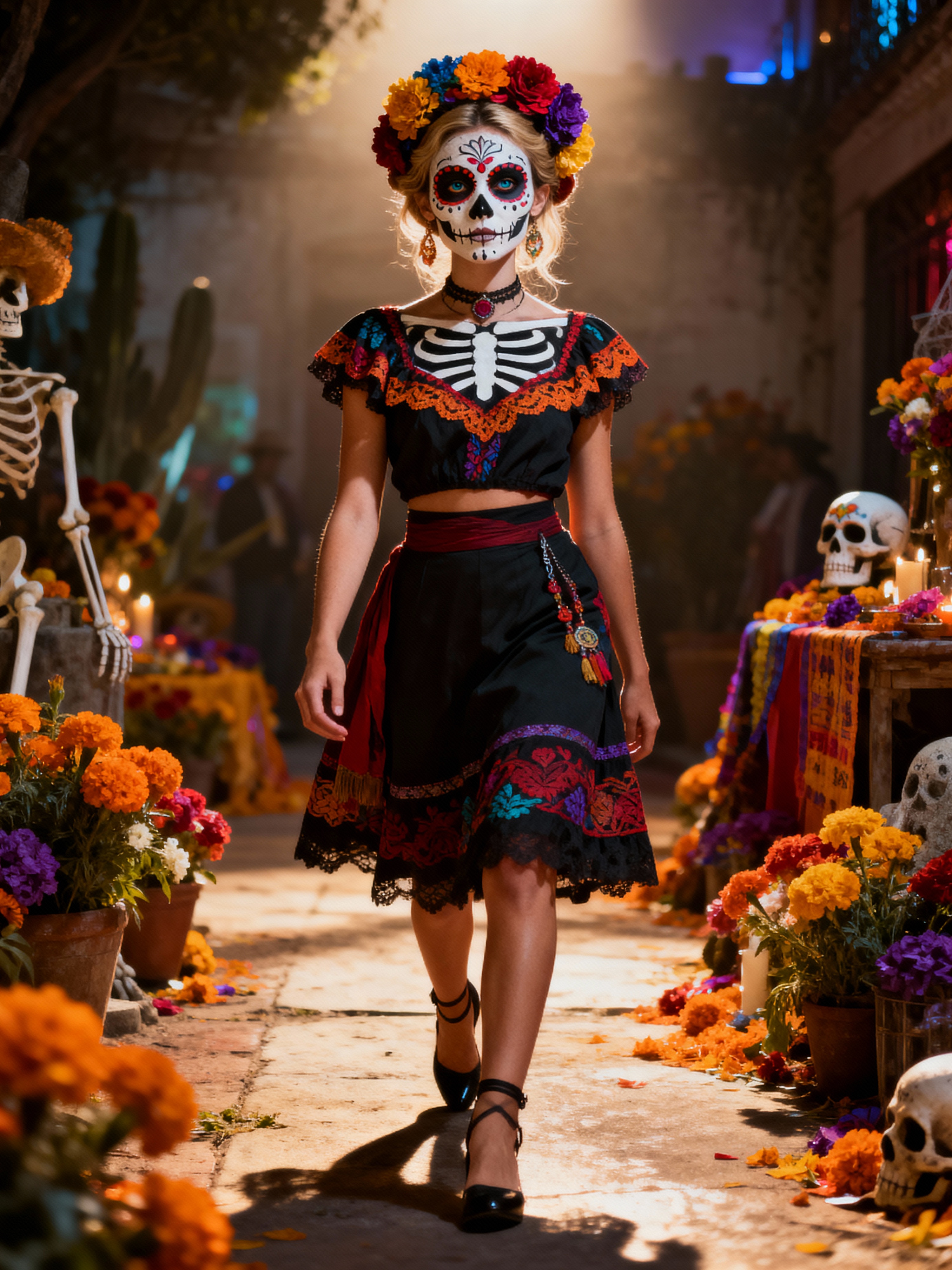 a model in a traditional outfit with modern fashion elements , embodying the balance of tradition and contemporary life during Day of the Dead