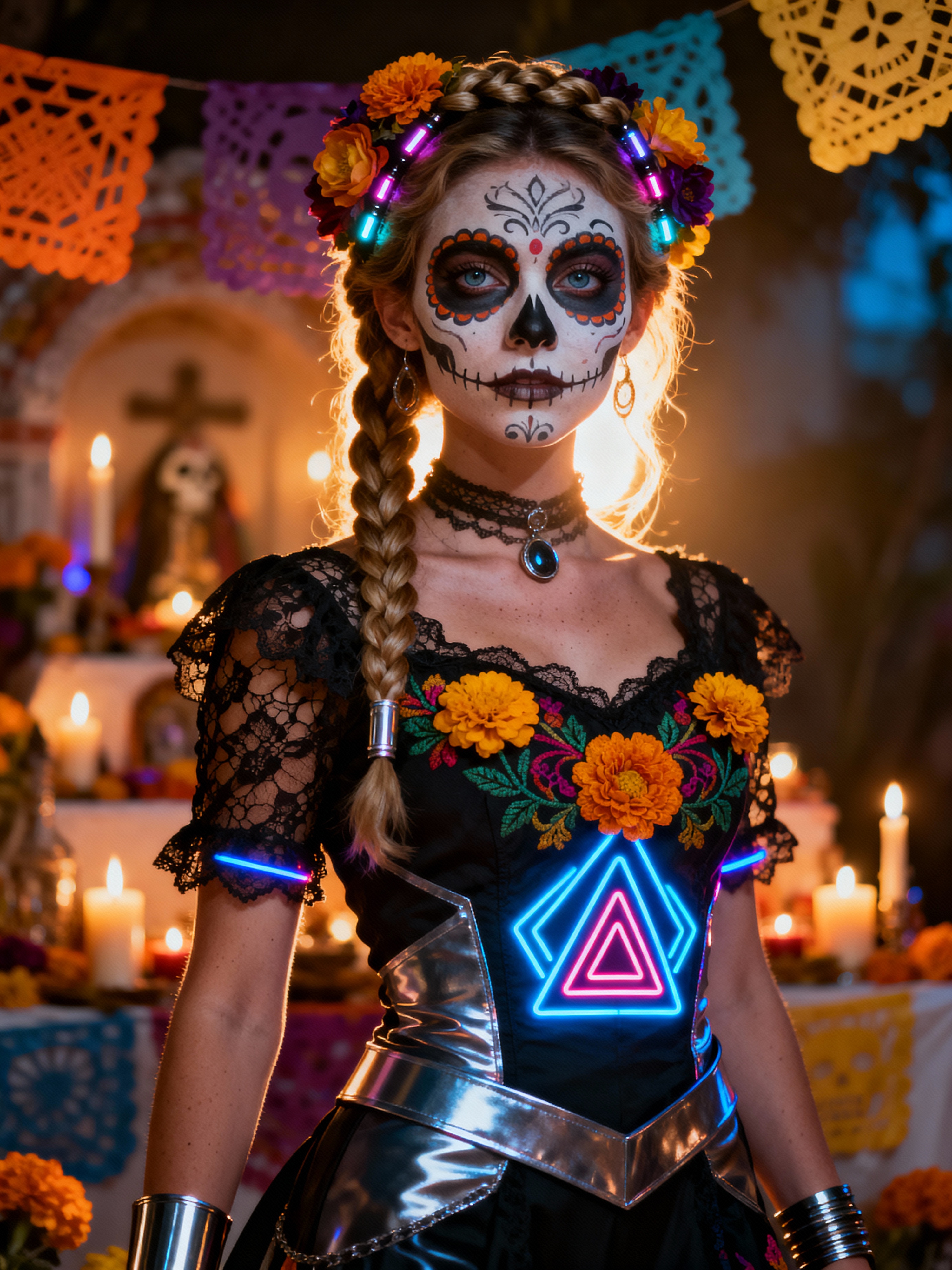 a model in a traditional outfit with modern fashion elements , embodying the balance of tradition and contemporary life during Day of the Dead