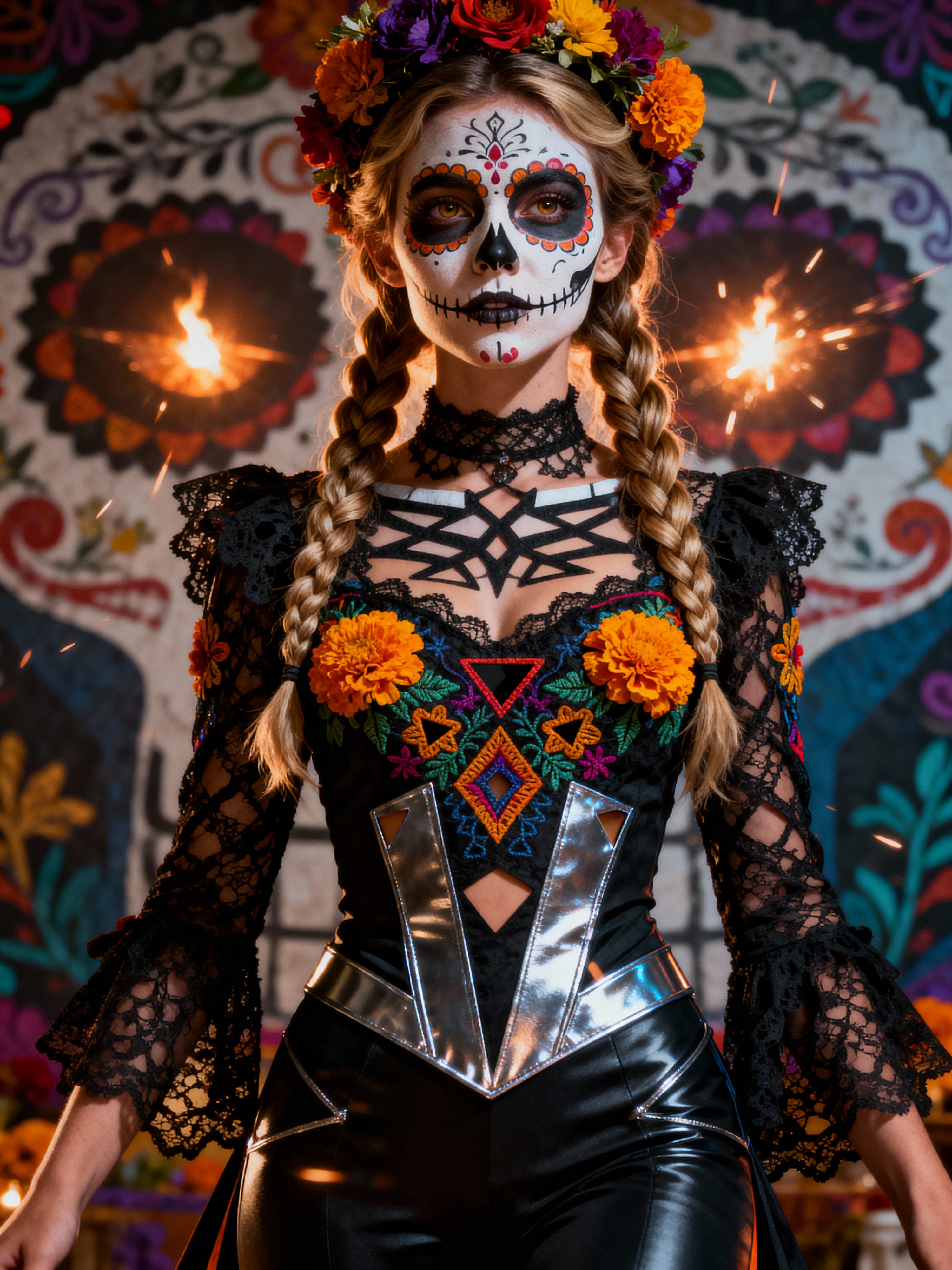 a model in a traditional outfit with modern fashion elements , embodying the balance of tradition and contemporary life during Day of the Dead
