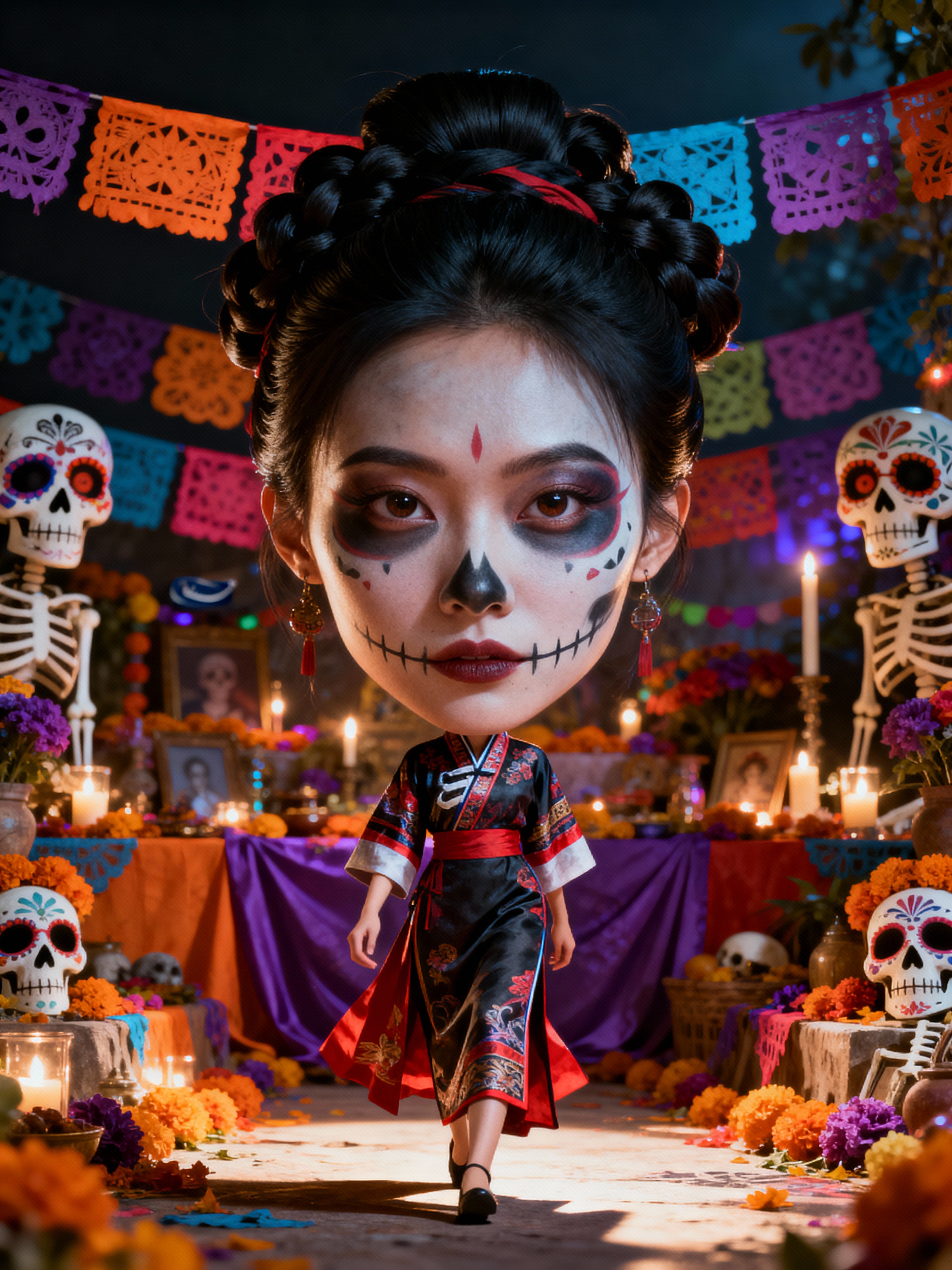 a model in a traditional outfit with modern fashion elements , embodying the balance of tradition and contemporary life during Day of the Dead