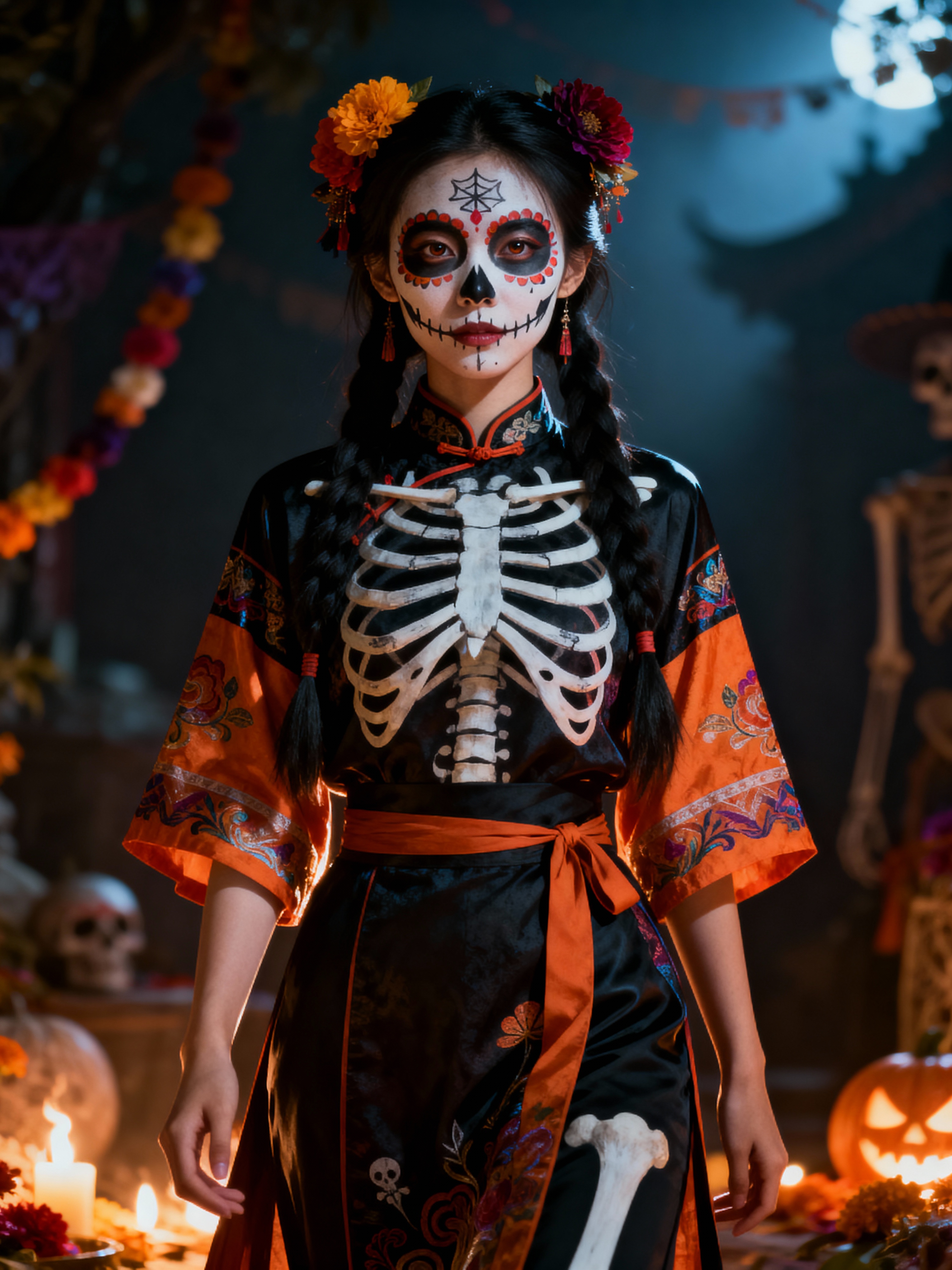 a model in a traditional outfit with modern fashion elements , embodying the balance of tradition and contemporary life during Day of the Dead
