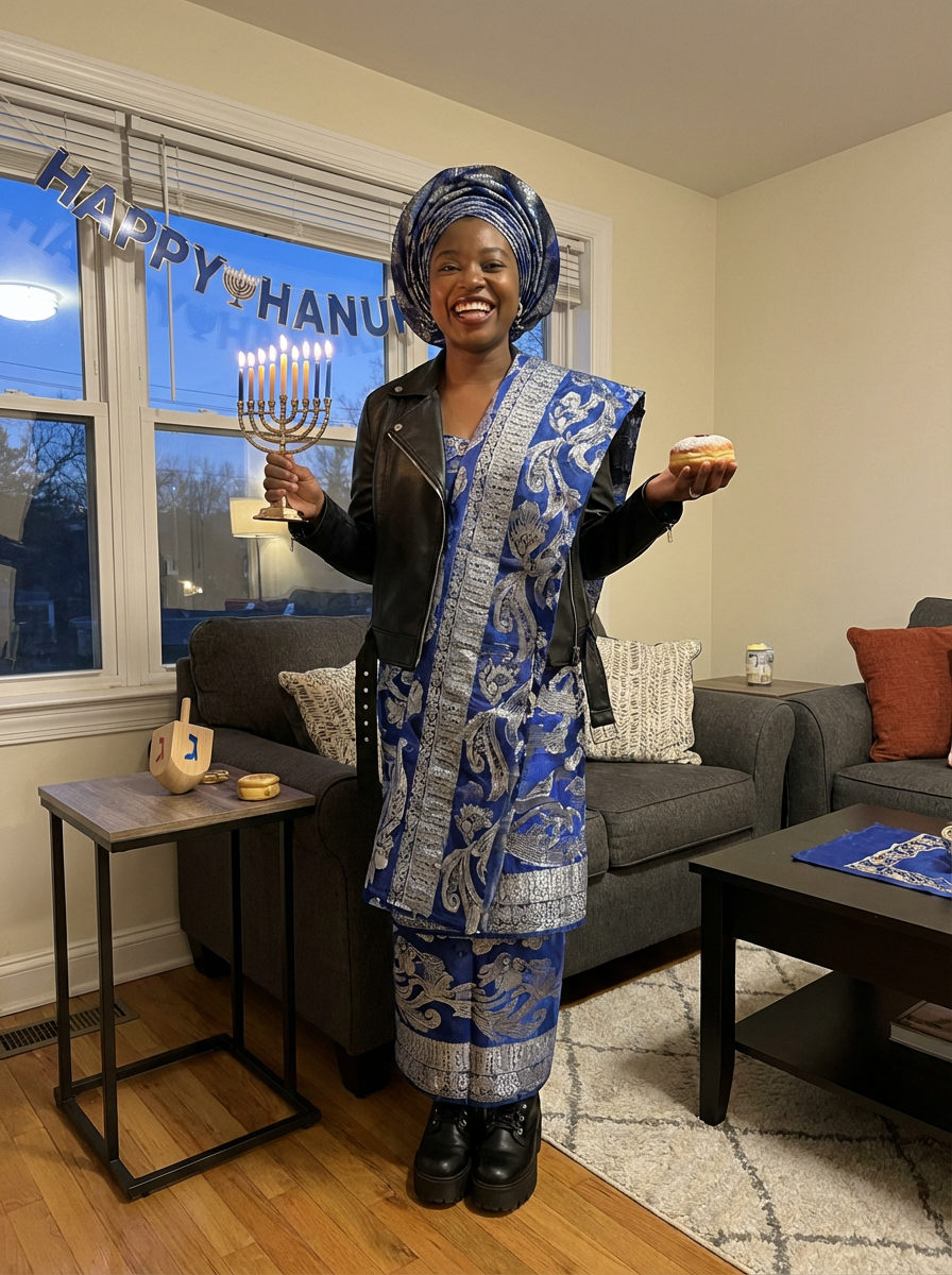 a model in a traditional outfit with modern fashion elements , embodying the balance of tradition and contemporary life during Hanukkah