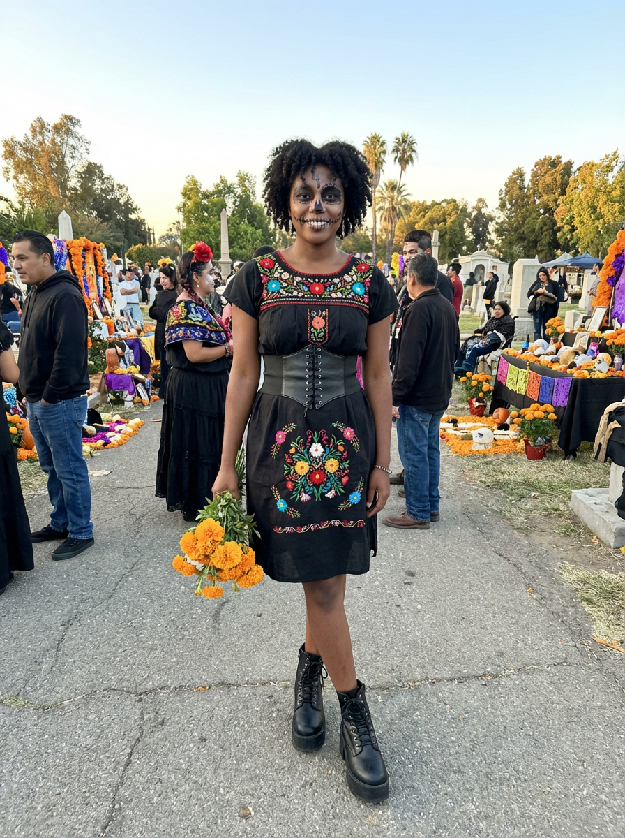 a model in a traditional outfit with modern fashion elements , embodying the balance of tradition and contemporary life during Day of the Dead