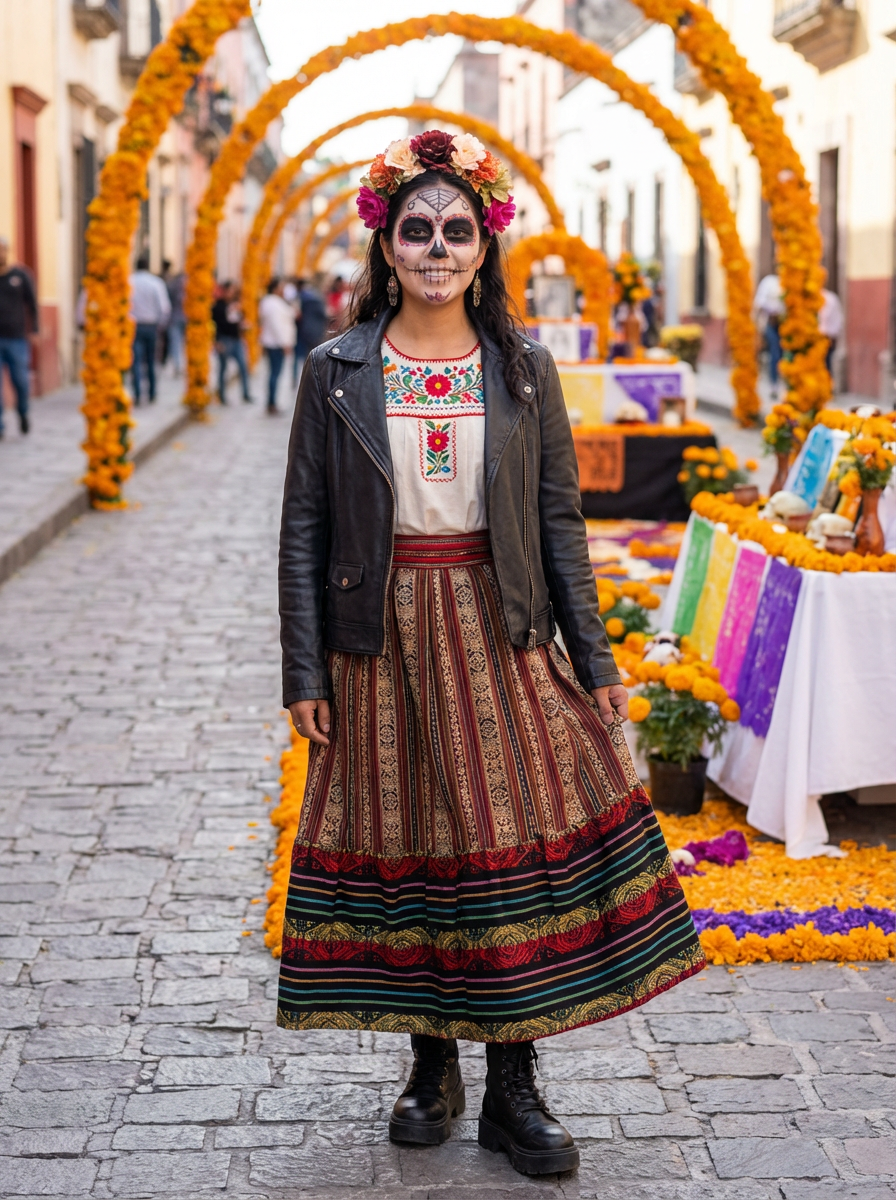 a model in a traditional outfit with modern fashion elements , embodying the balance of tradition and contemporary life during Day of the Dead