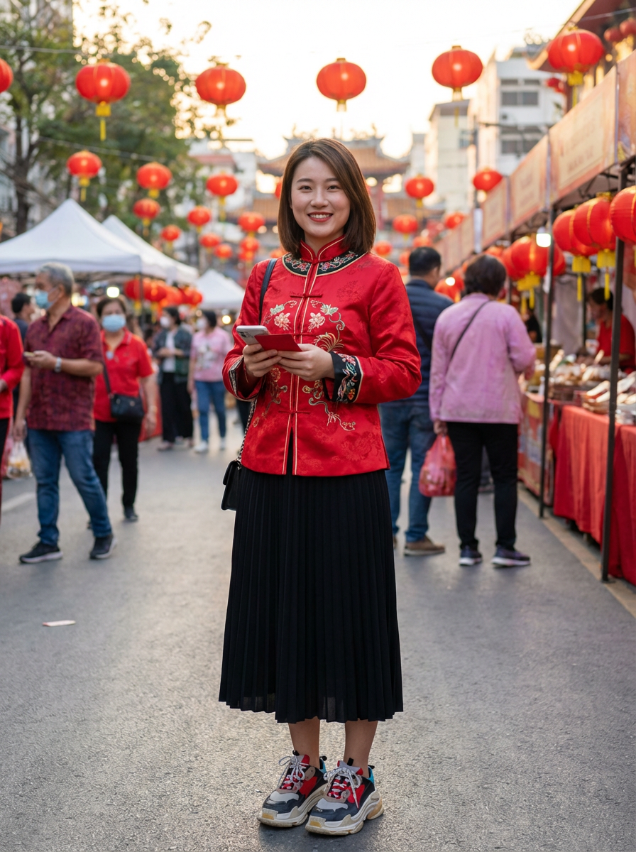 a model in a traditional outfit with modern fashion elements , embodying the balance of tradition and contemporary life during Chinese New Year