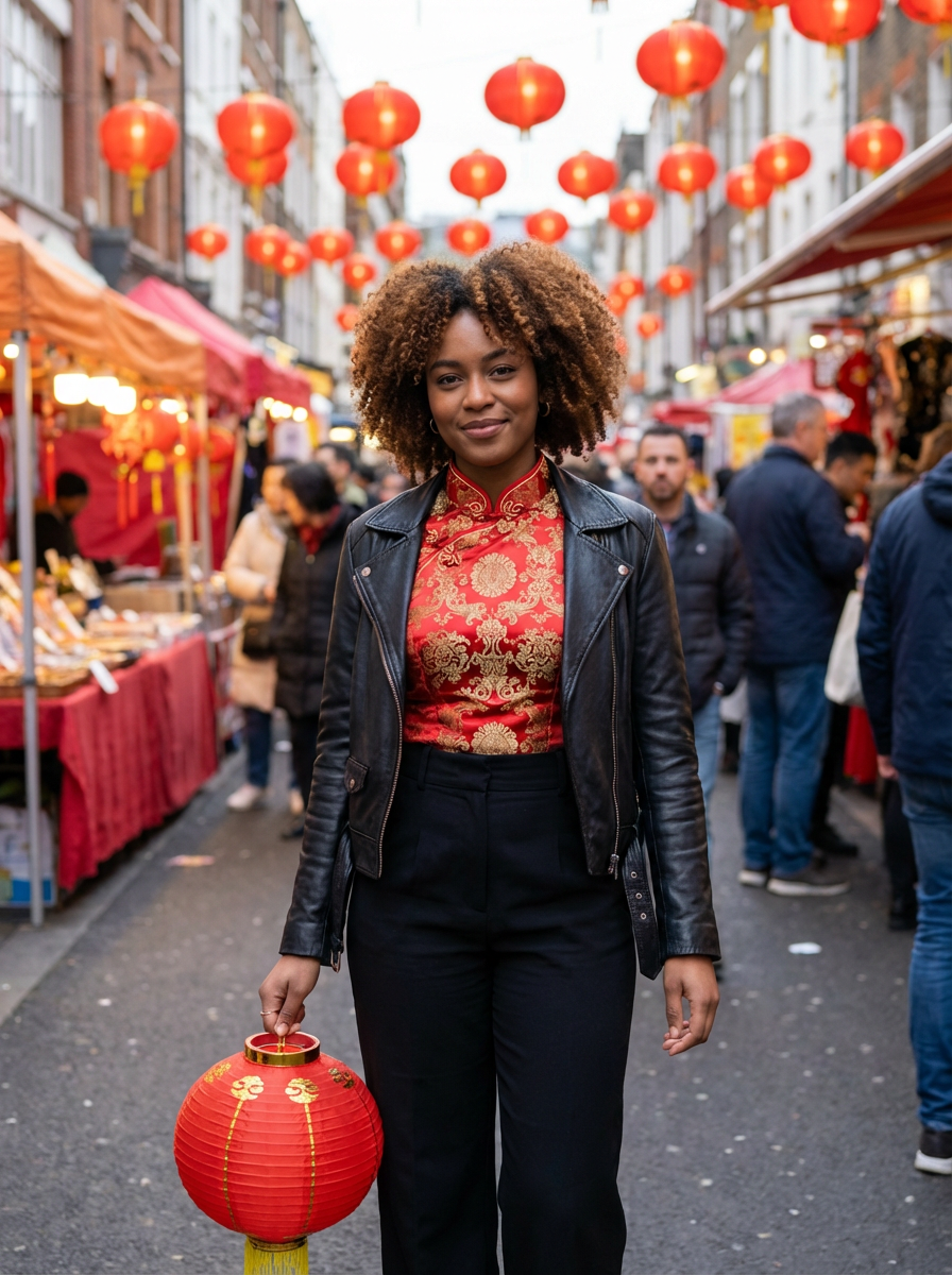 a model in a traditional outfit with modern fashion elements , embodying the balance of tradition and contemporary life during Chinese New Year