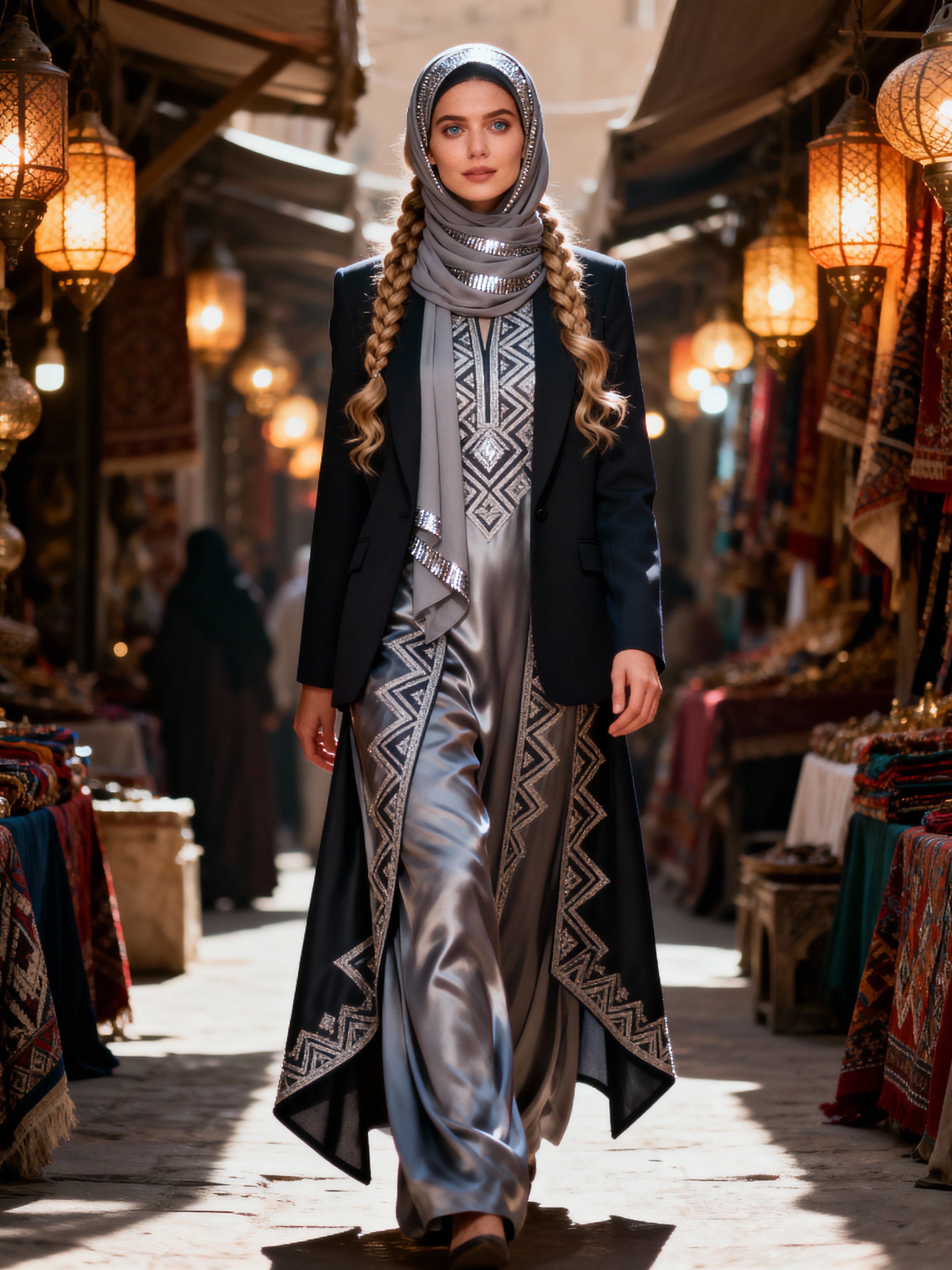 a model in a traditional outfit with modern modest fashion elements , embodying the balance of tradition and contemporary life during Eid