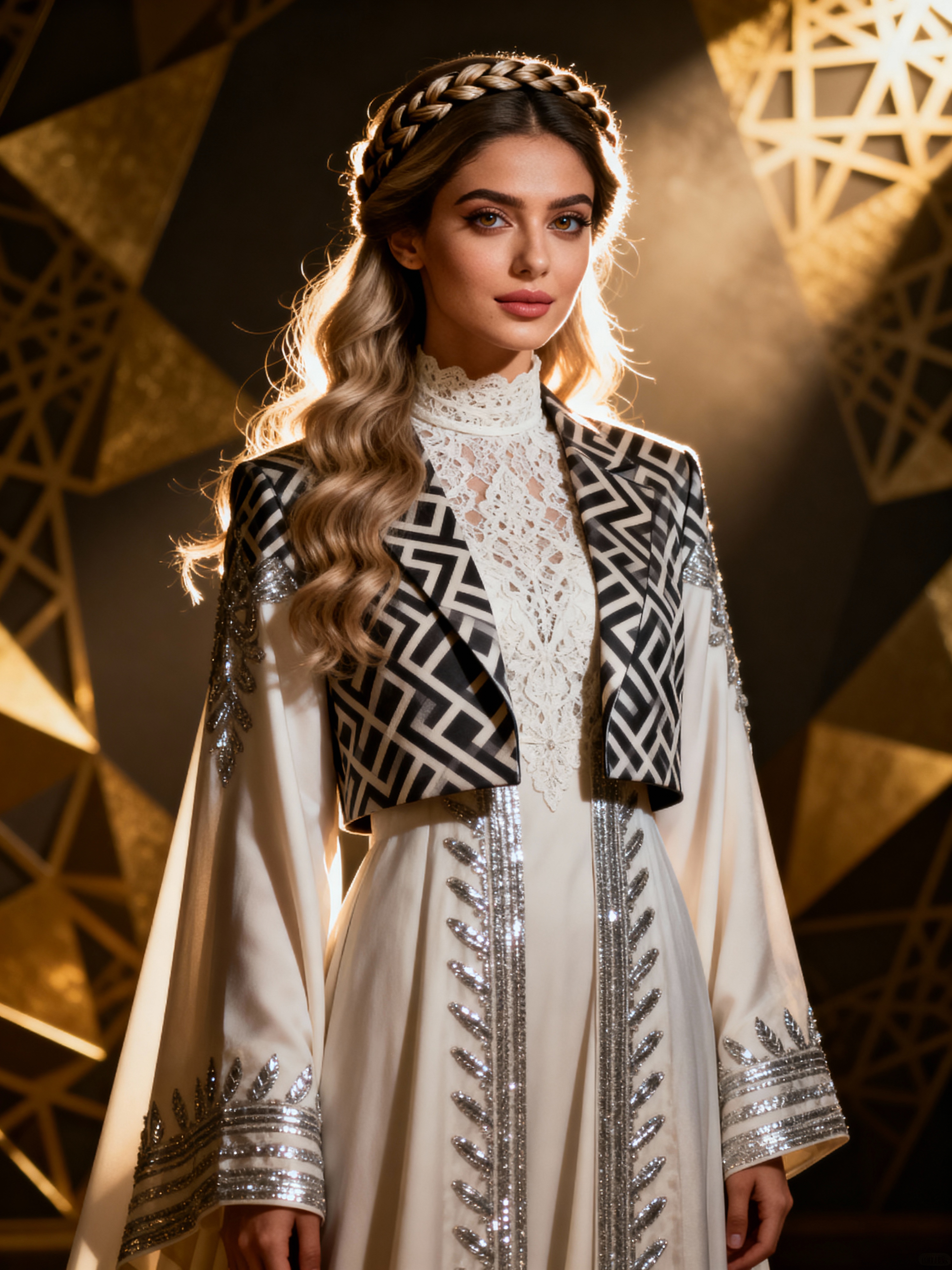 a model in a traditional outfit with modern modest fashion elements , embodying the balance of tradition and contemporary life during Eid