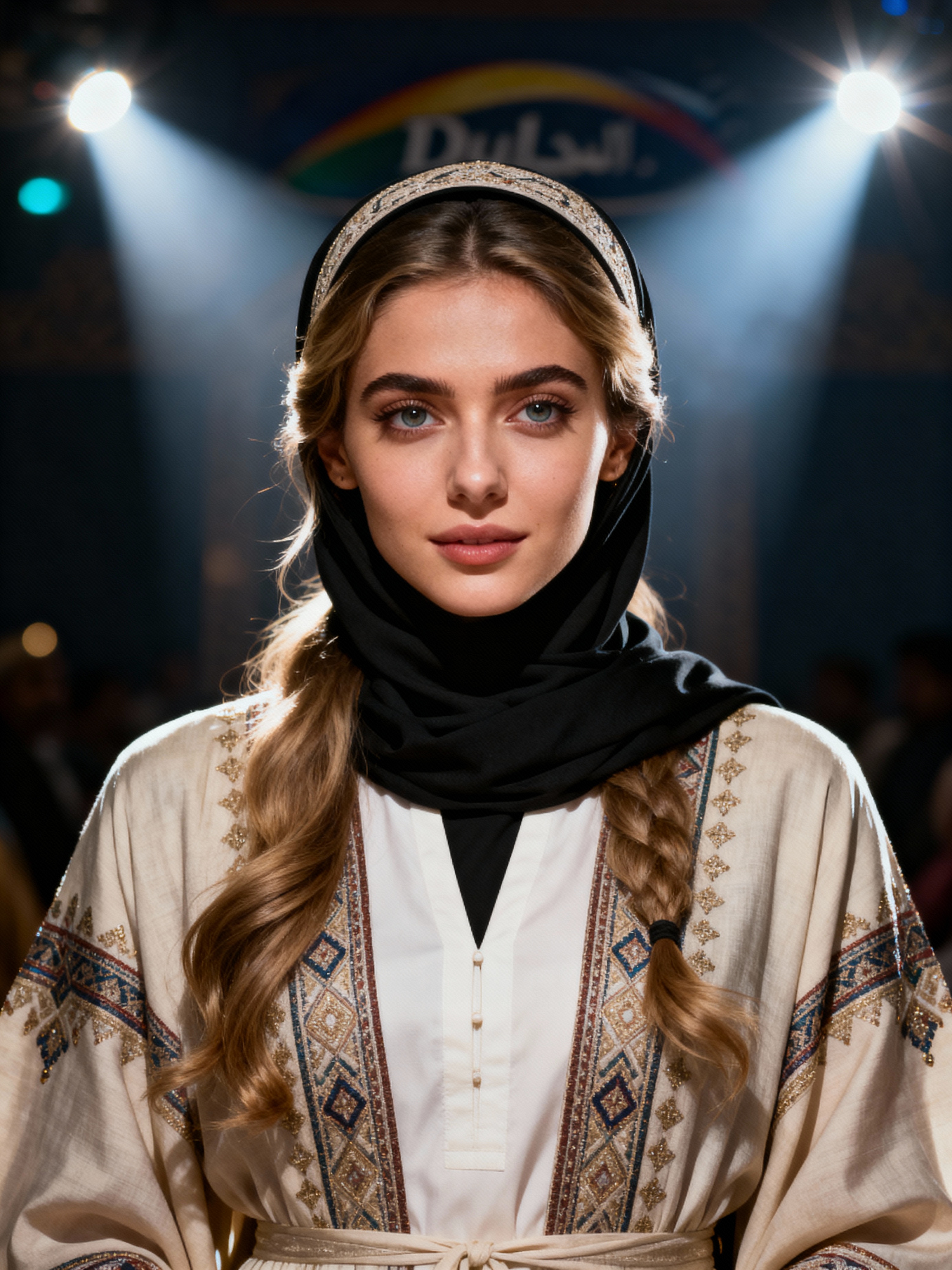 a model in a traditional outfit with modern modest fashion elements , embodying the balance of tradition and contemporary life during Eid