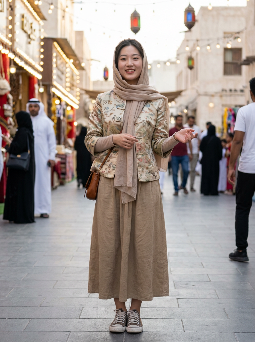 a model in a traditional outfit with modern modest fashion elements , embodying the balance of tradition and contemporary life during Eid
