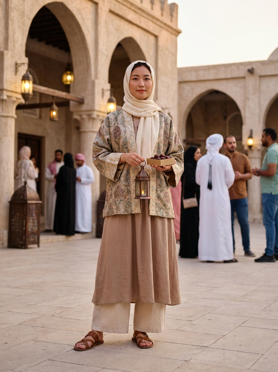a model in a traditional outfit with modern modest fashion elements , embodying the balance of tradition and contemporary life during Ramadan