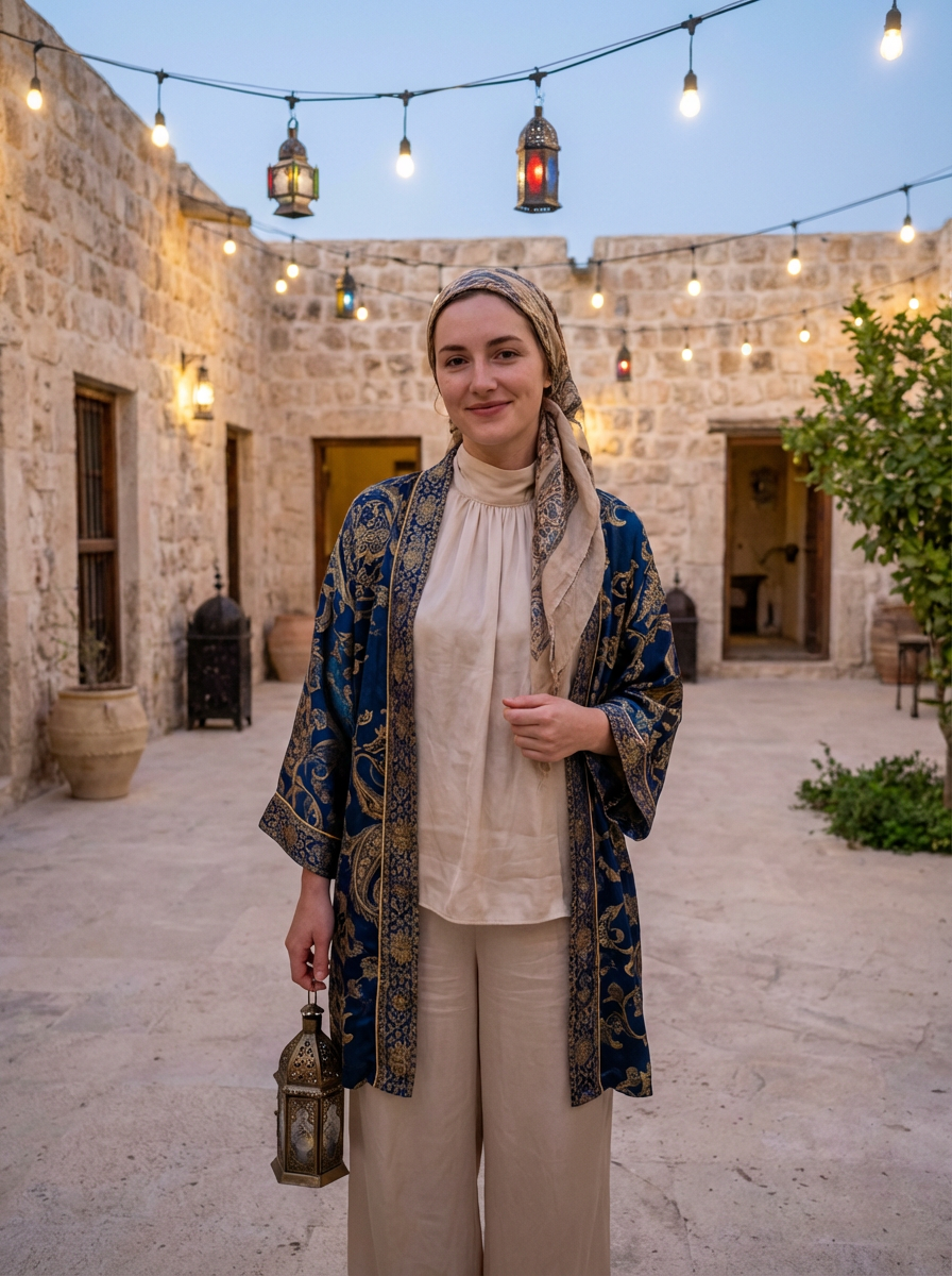 a model in a traditional outfit with modern modest fashion elements , embodying the balance of tradition and contemporary life during Ramadan