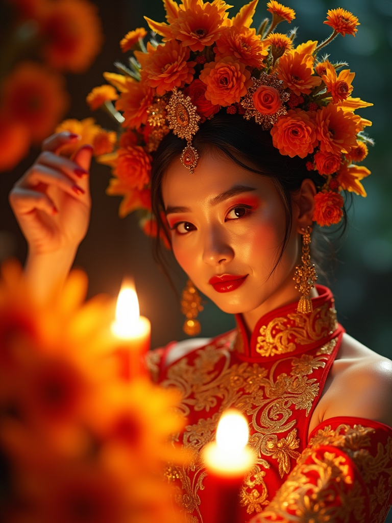 a model in a vibrant Catrina costume with floral headdress , striking a pose with beautiful marigold petals and candlelight casting warm patterns