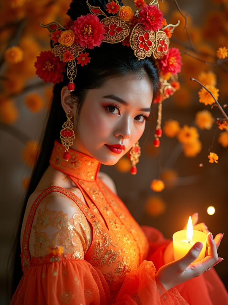 a model in a vibrant Catrina costume with floral headdress , striking a pose with beautiful marigold petals and candlelight casting warm patterns