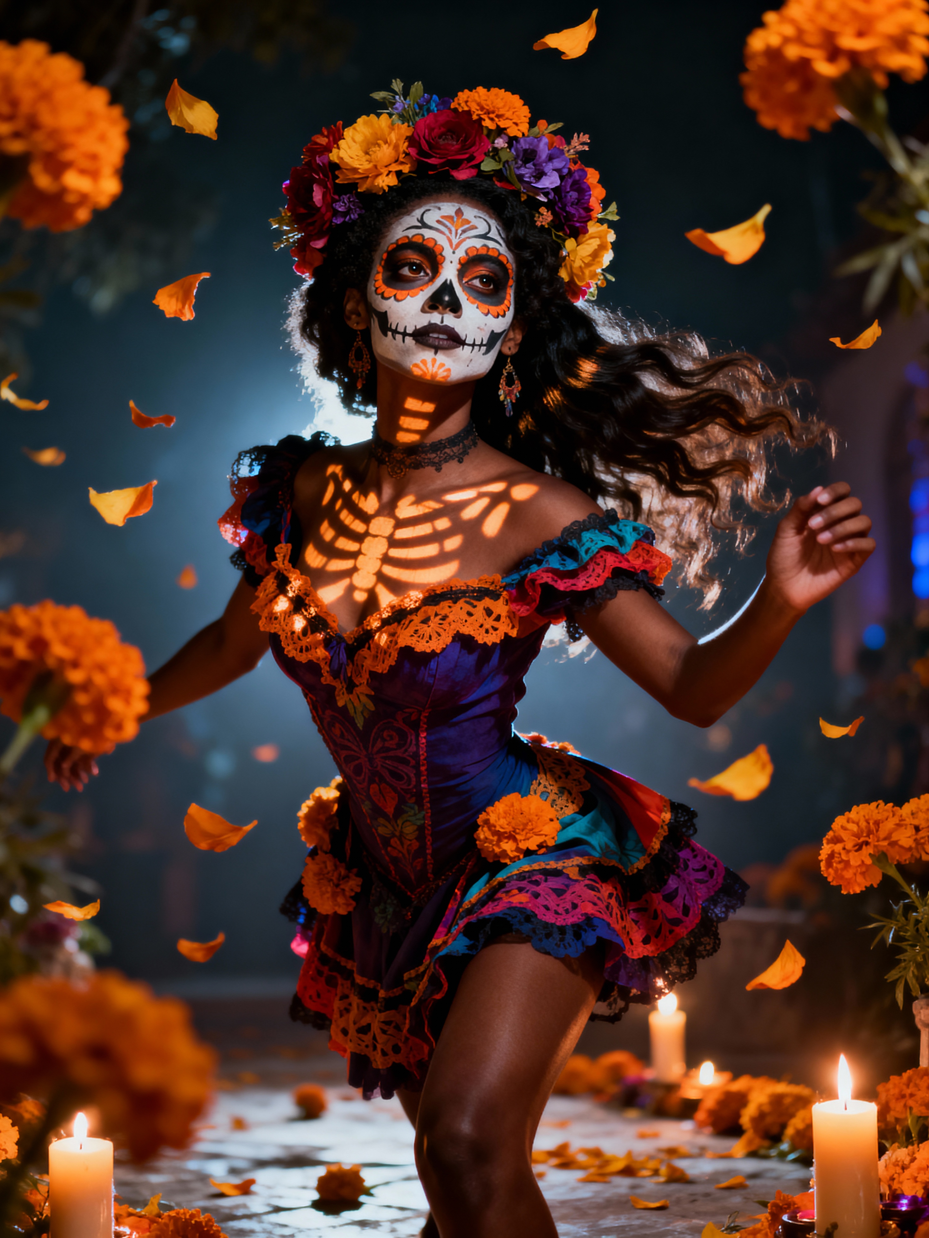 a model in a vibrant Catrina costume with floral headdress , striking a pose with beautiful marigold petals and candlelight casting warm patterns