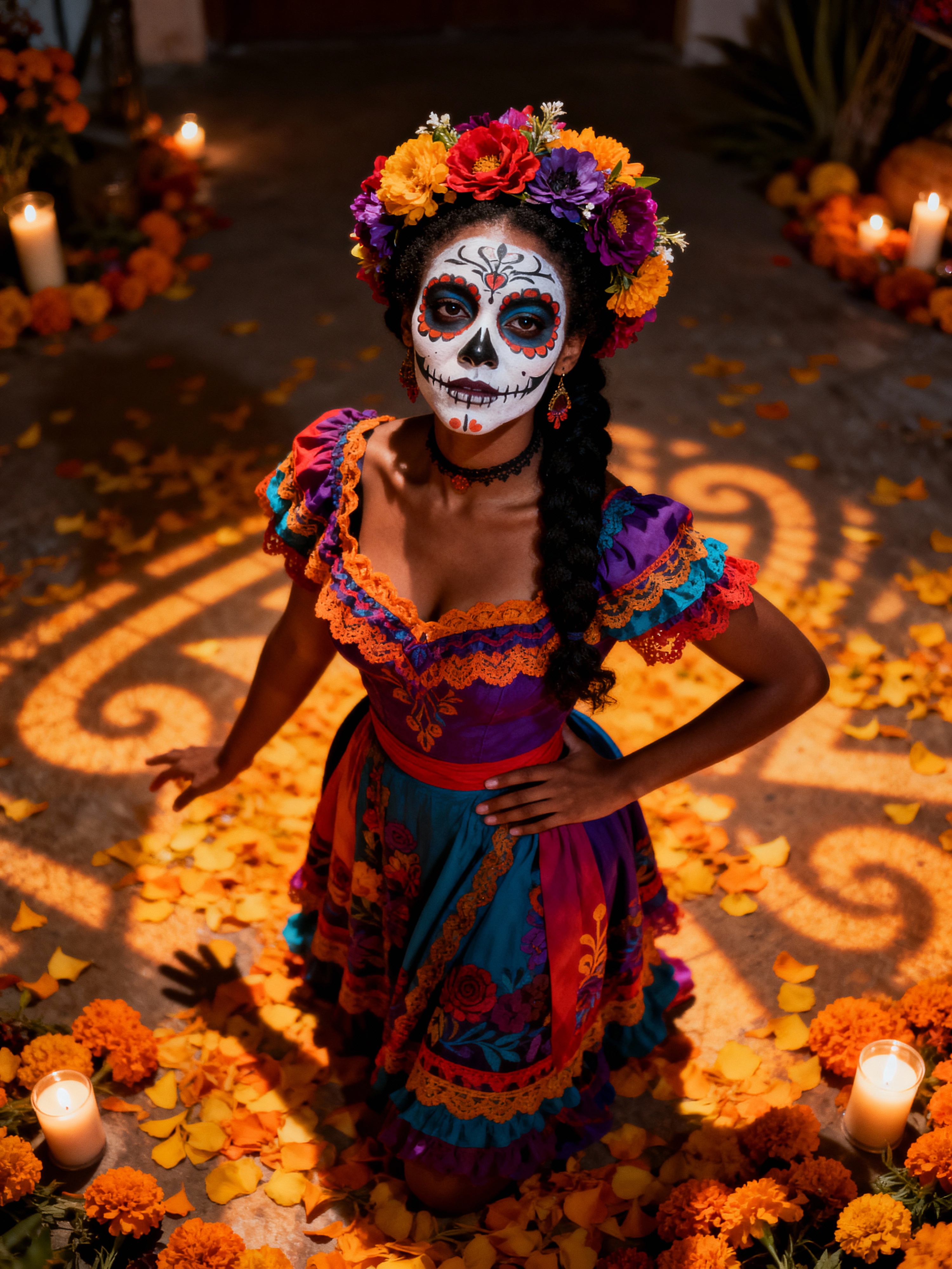 a model in a vibrant Catrina costume with floral headdress , striking a pose with beautiful marigold petals and candlelight casting warm patterns