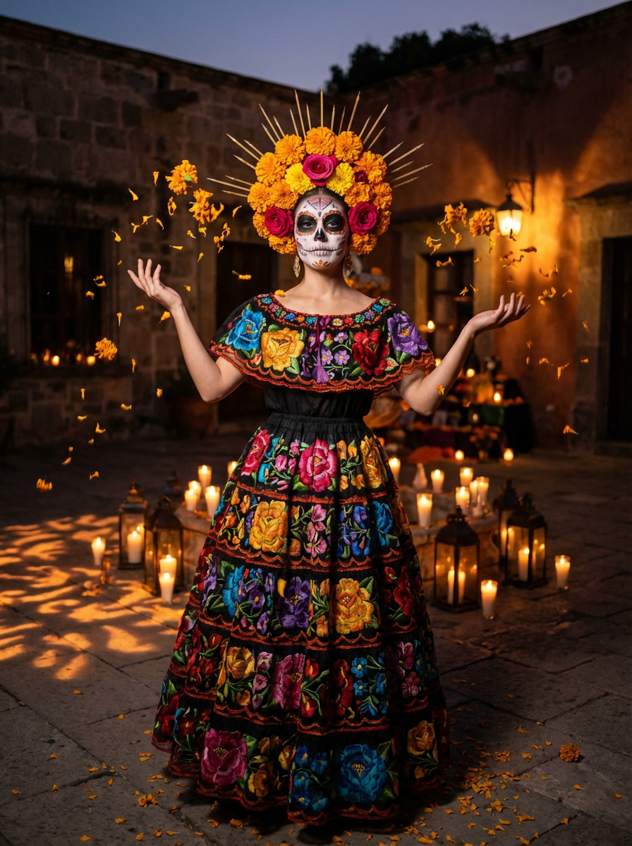 a model in a vibrant Catrina costume with floral headdress , striking a pose with beautiful marigold petals and candlelight casting warm patterns
