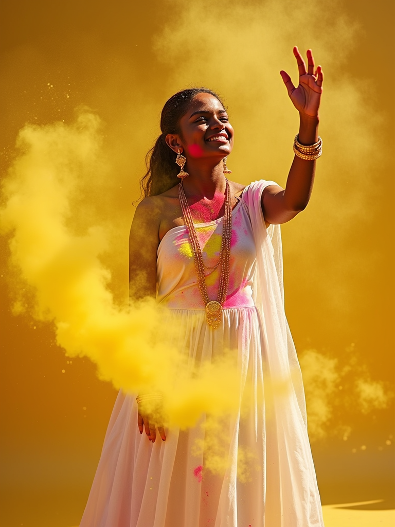 a model in a white salwar kameez now rainbow-colored from Holi powders , striking a pose while throwing handfuls of bright yellow powder