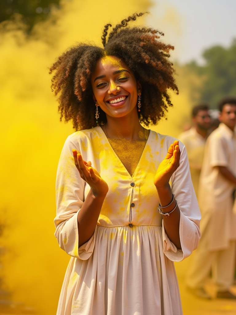 a model in a white salwar kameez now rainbow-colored from Holi powders , striking a pose while throwing handfuls of bright yellow powder