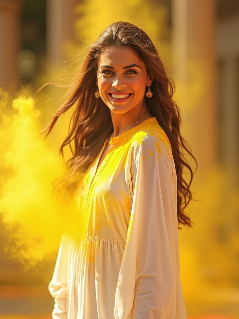 a model in a white salwar kameez now rainbow-colored from Holi powders , striking a pose while throwing handfuls of bright yellow powder