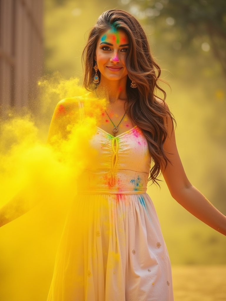 a model in a white salwar kameez now rainbow-colored from Holi powders , striking a pose while throwing handfuls of bright yellow powder