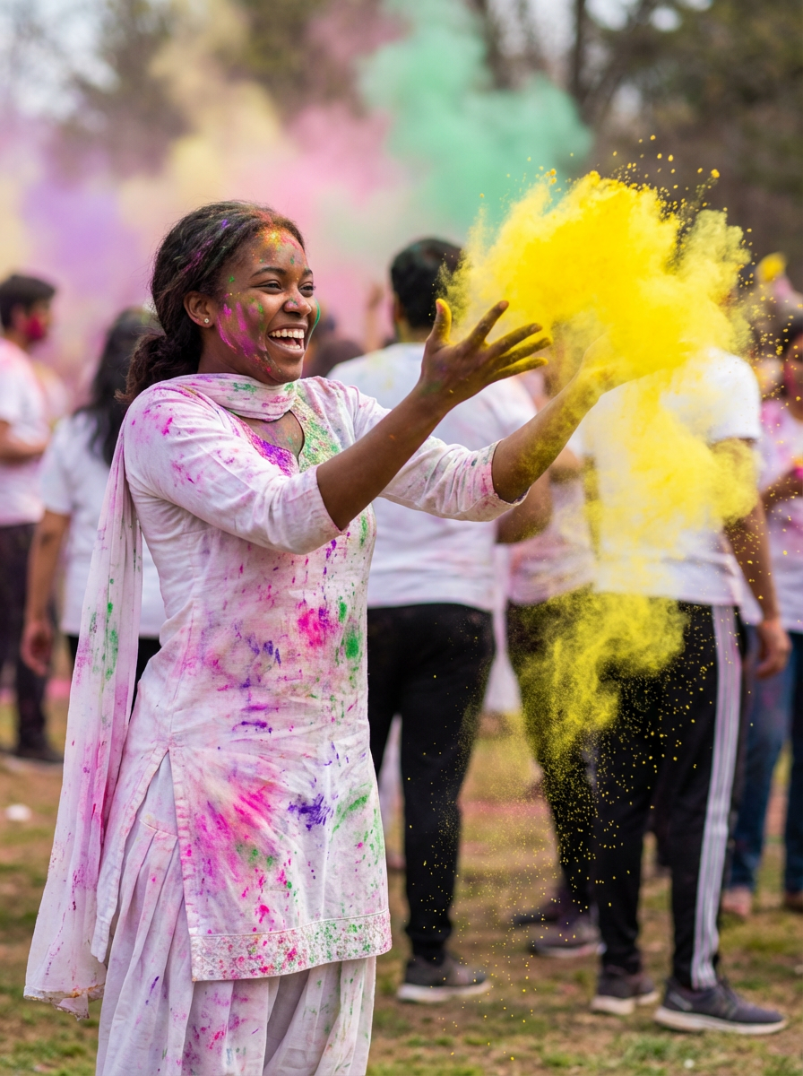 a model in a white salwar kameez now rainbow-colored from Holi powders , striking a pose while throwing handfuls of bright yellow powder
