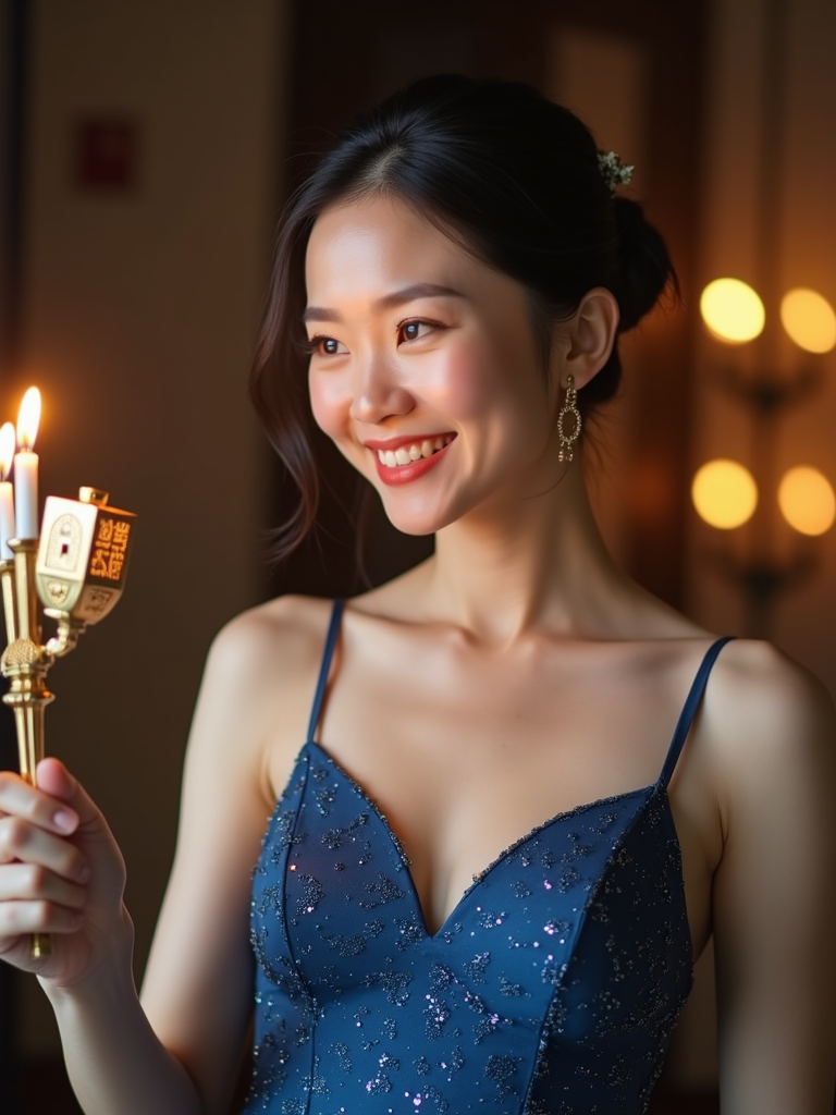 a model in an elegant blue dress with subtle sparkles , embodying the joyful and spiritual nature of Hanukkah, with a dreidel or menorah in hand