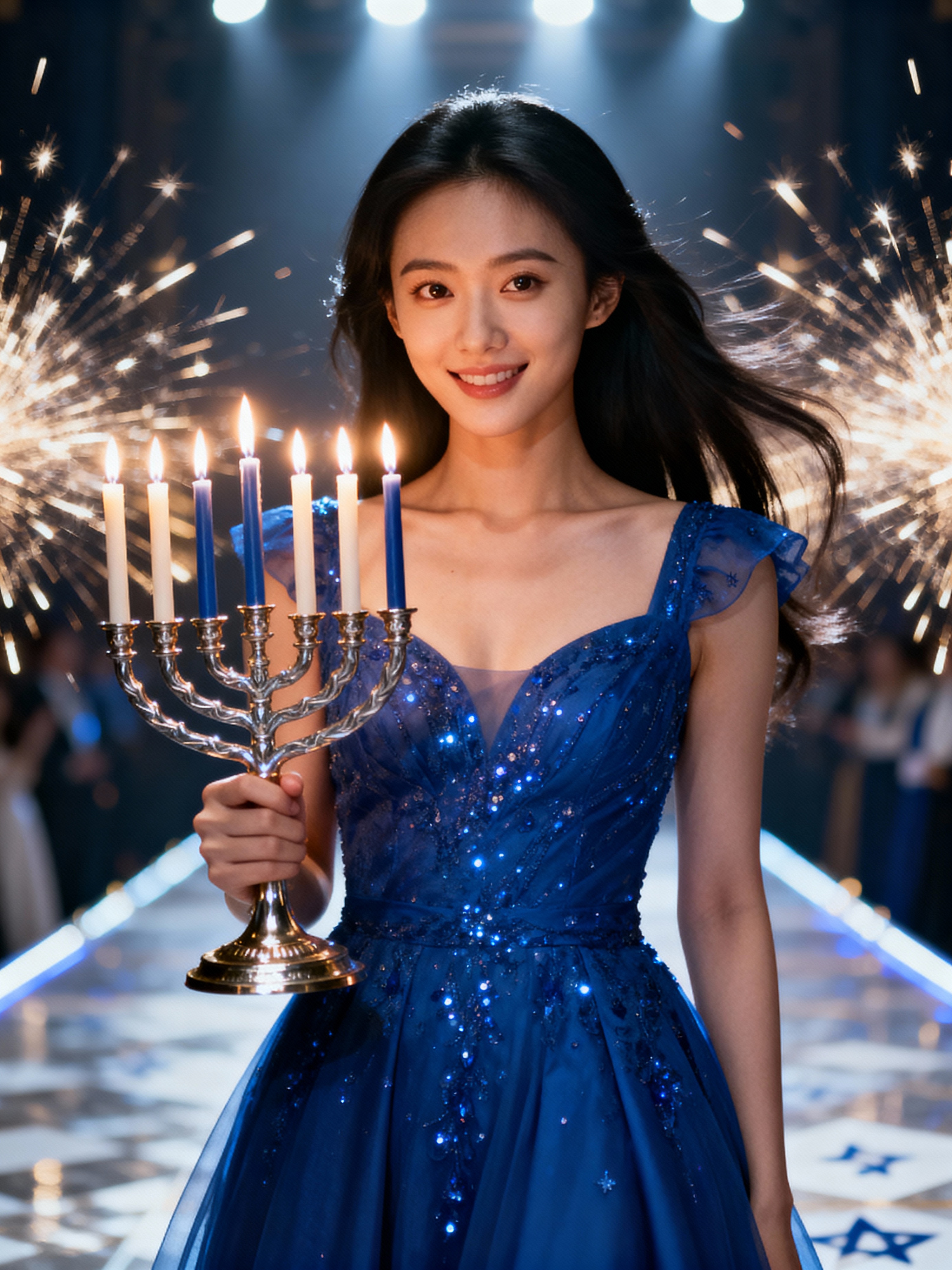 a model in an elegant blue dress with subtle sparkles , embodying the joyful and spiritual nature of Hanukkah, with a dreidel or menorah in hand