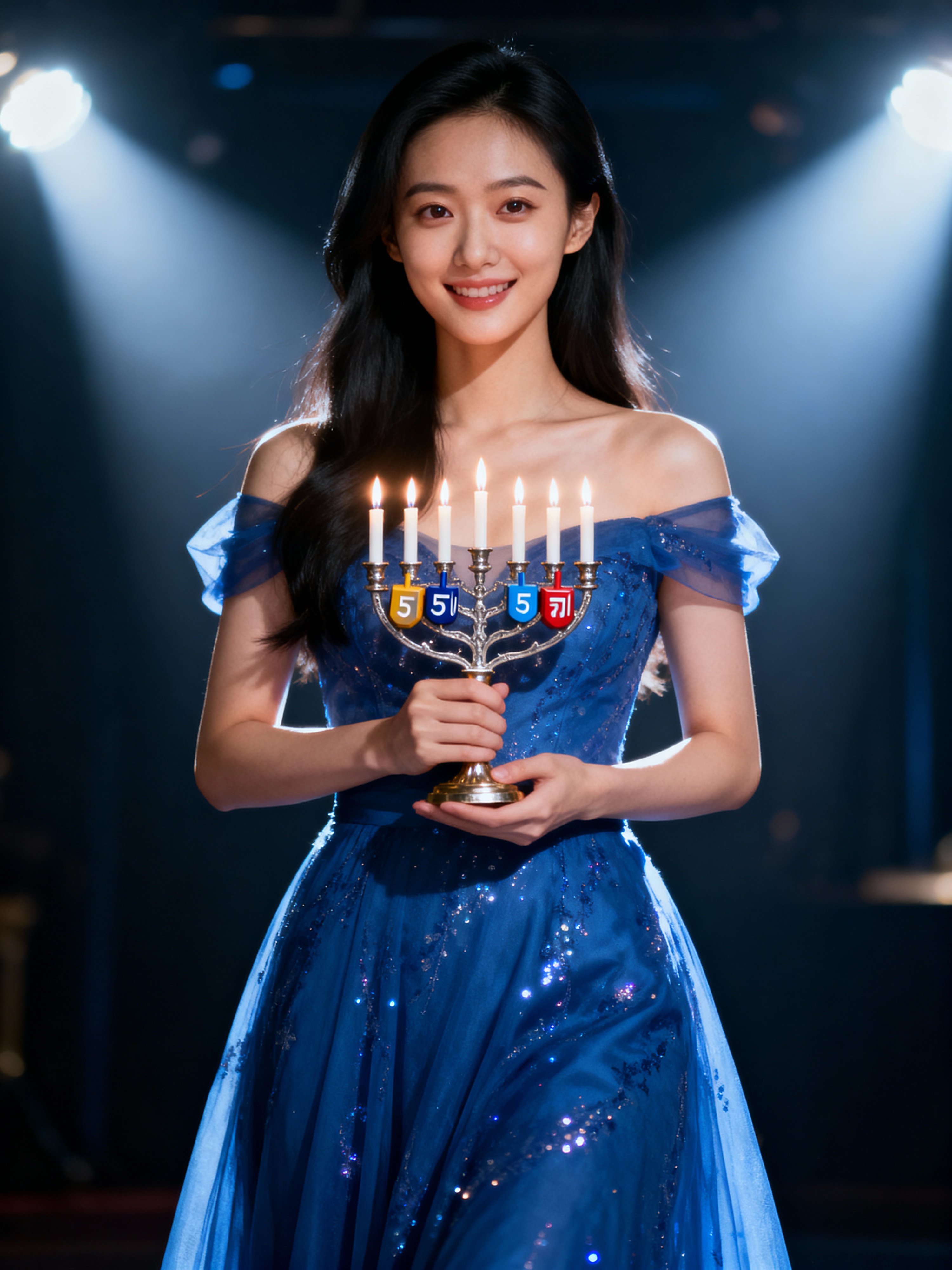 a model in an elegant blue dress with subtle sparkles , embodying the joyful and spiritual nature of Hanukkah, with a dreidel or menorah in hand